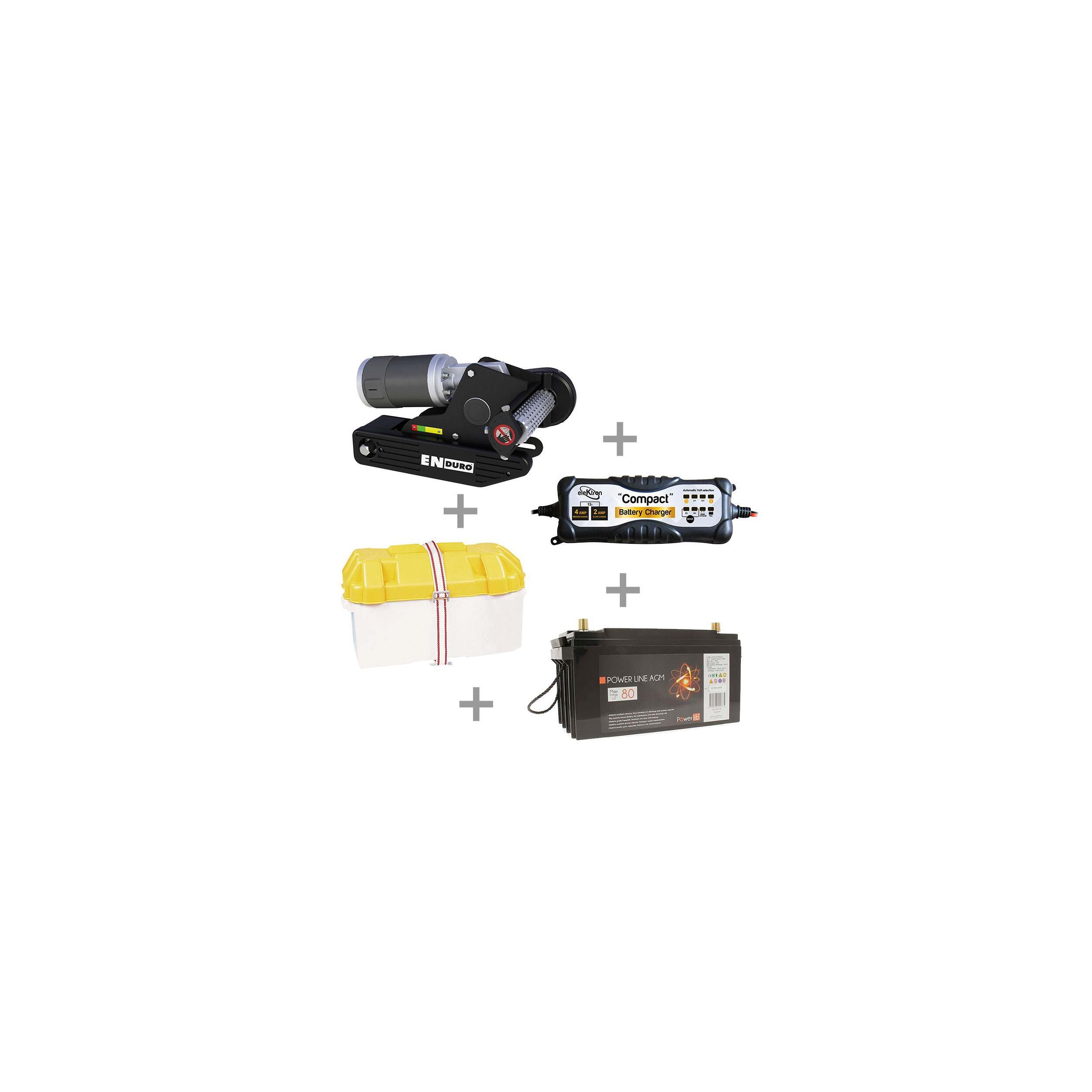 Pack déplace caravane Enduro EM203 + Batterie 80A : 1 déplace caravane Enduro EM203 manuel + 1 batterie auxiliaire 80 Ampères + 1 bac de protection batterie + 1 chargeur compact pour batterie