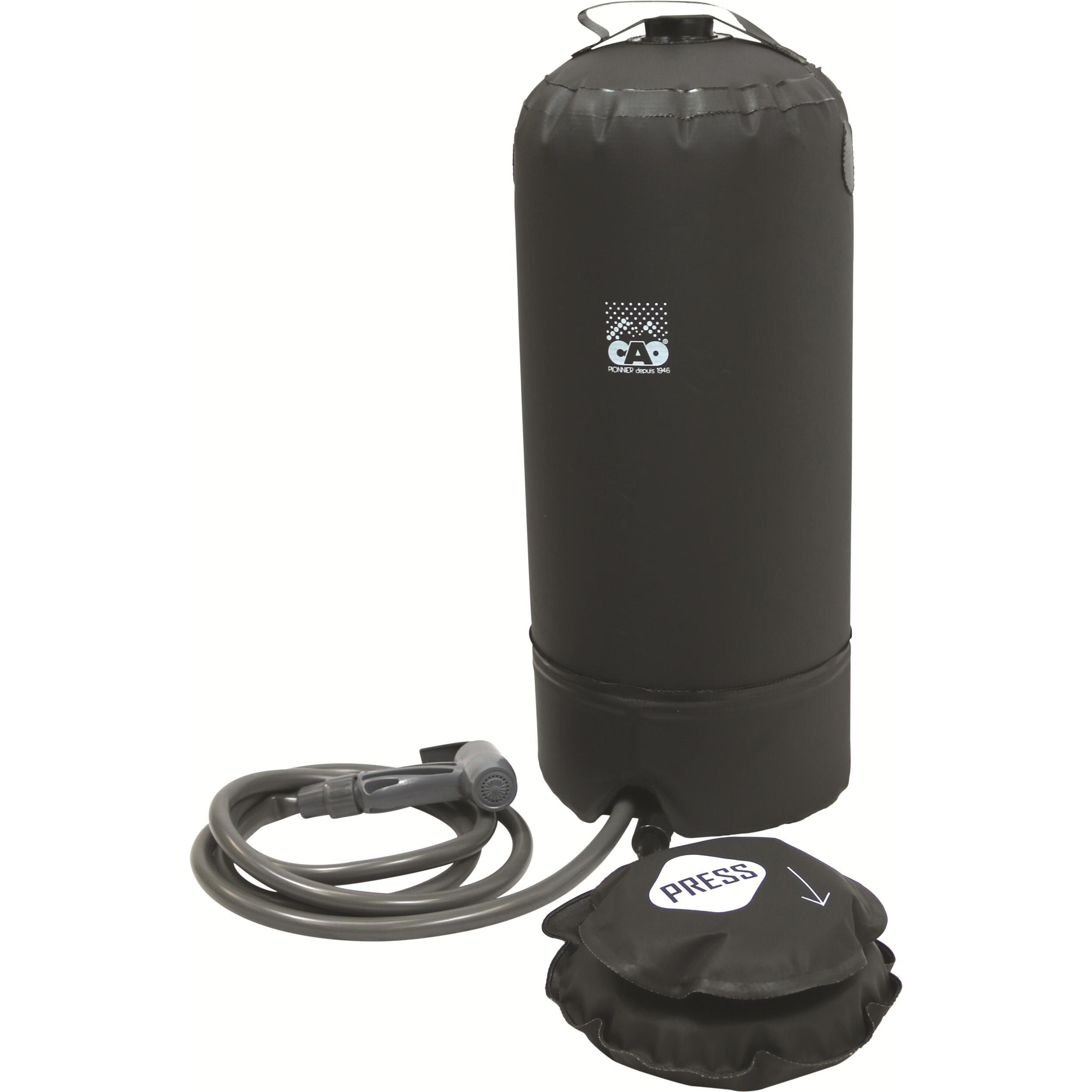 Douche solaire par pression (pompe). La sac conserve l'eau chauffée par les rayons du soleil. Avec sac et poignée pour le transport.