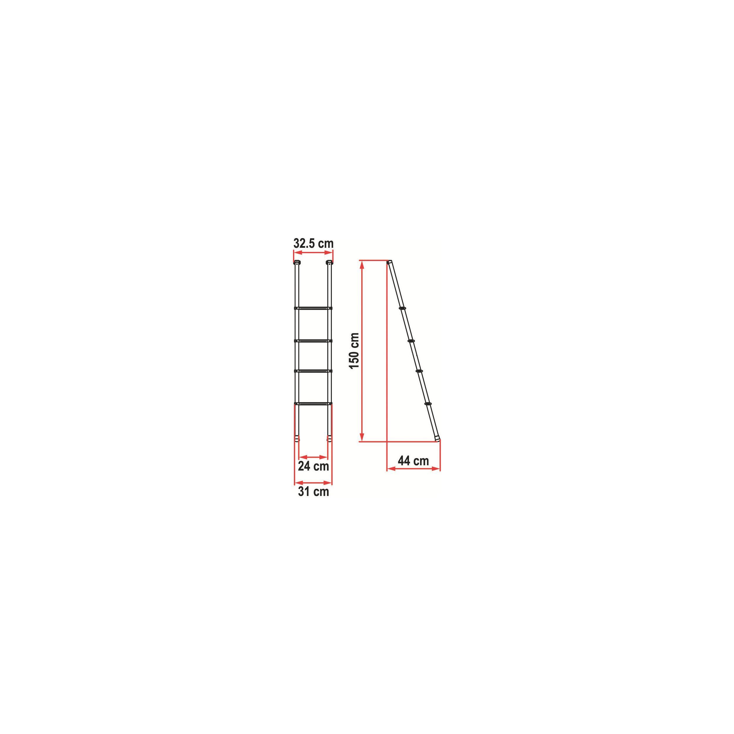 Hauteur une fois inclinée : 150 cm. Profondeur entre le haut et le bas de l'échelle une fois inclinée : 44 cm.