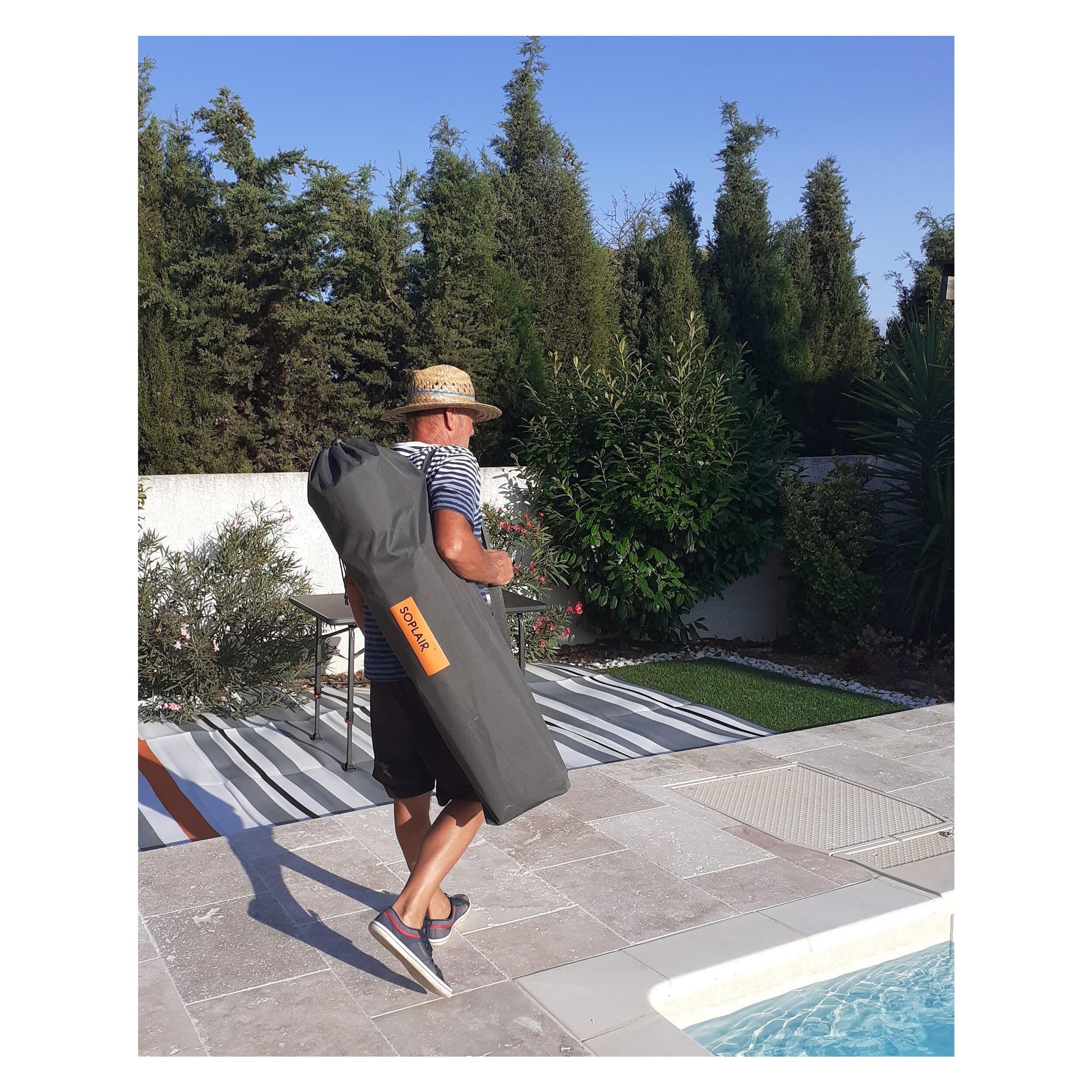 La chaise longue Belem est très compacte afin de faciliter son transport pour le camping ou en véhicule de loisir. Les dimensions pliées lui permettent d’être rangé dans un sac de transport fourni. Grâce à son pliage parapluie, vous pouvez amener le fauteuil relax Belem où vous voulez!