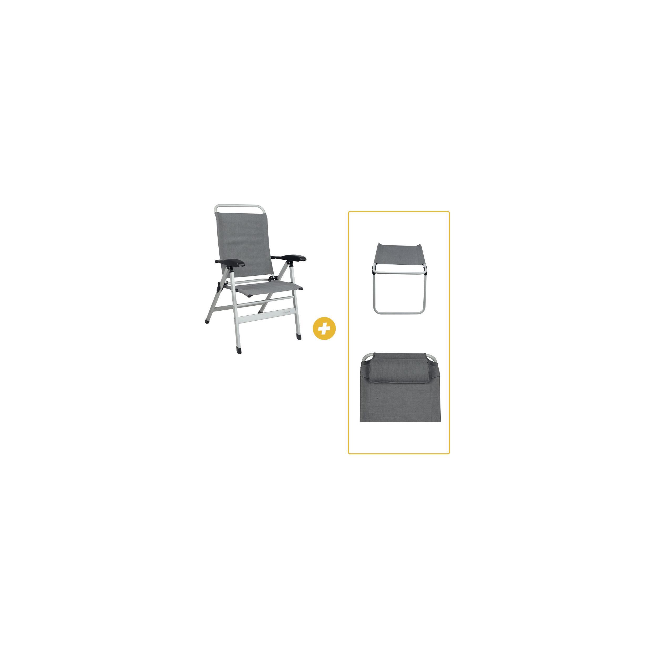 Le pack est composé d'un fauteuil de camping Confort en aluminium Gris baya (RG-078788C) avec un repose-jambes associé (RG-078789C) et d'un repose-tête associé (RG-078710C).