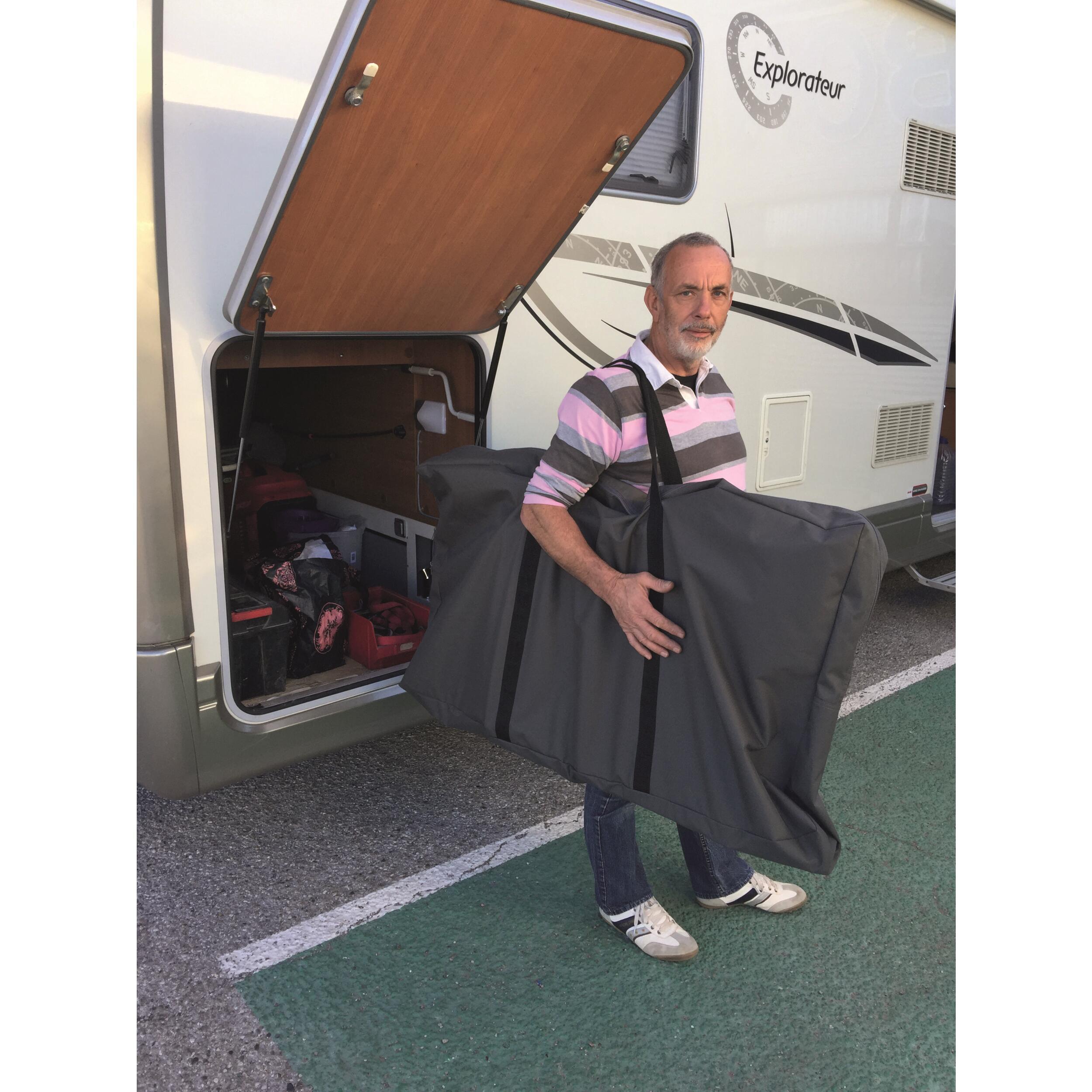 La housse de transport convient pour ranger des fauteuils, repose jambes et repose têtes. Elle va permettre notamment de stocker ces accessoires de camping tout en les protégeant. Vous pouvez ensuite ranger la housse pour fauteuil dans la soute ou coffre de votre véhicule de loisirs (camping-car, van, fourgon aménagé, caravane, bateau...). Ainsi, vos fauteuils de camping seront mis à l'abri et verront leur durée de vie se prolonger.