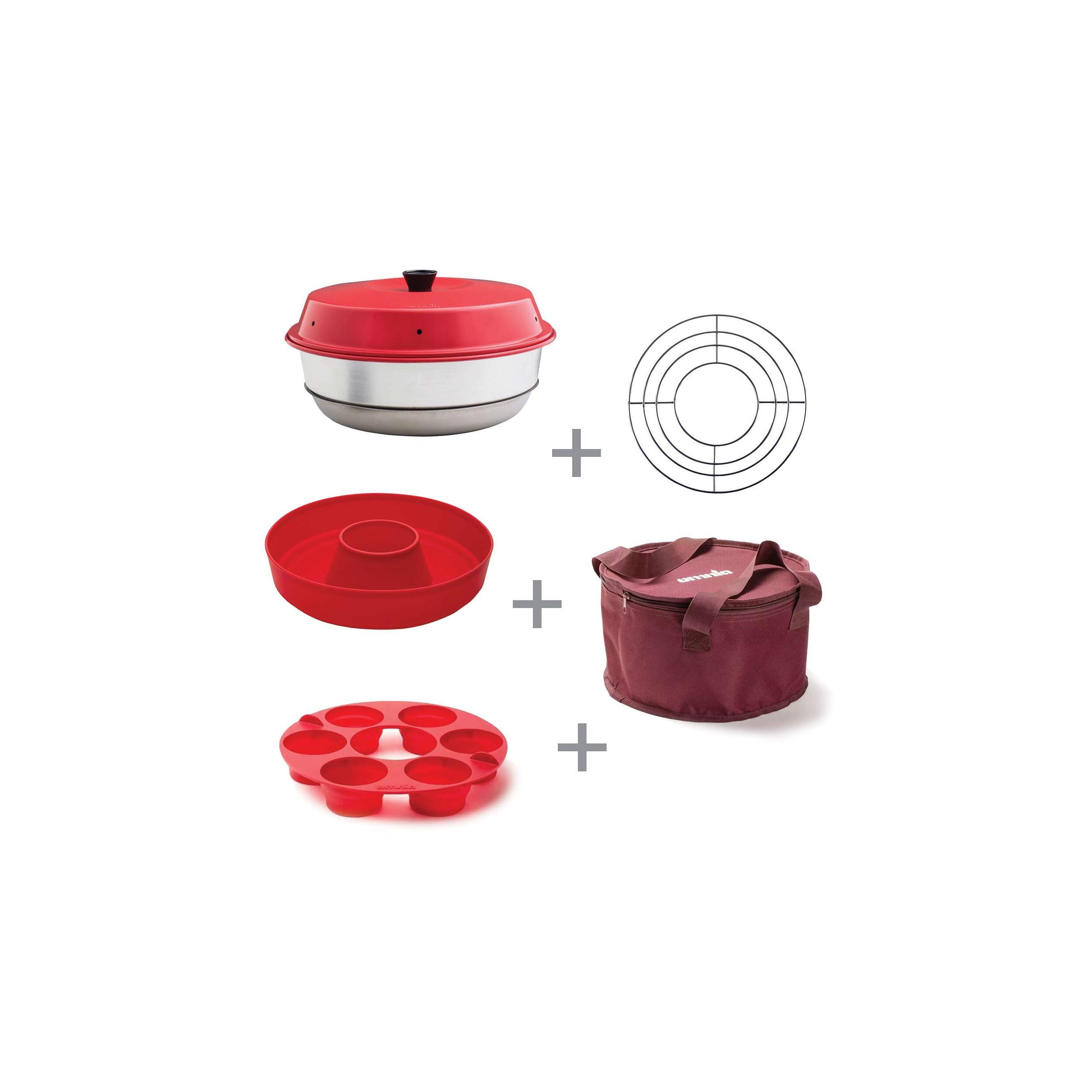 Pratique quand on a pas de four. On peut même y faire des tartes (voir photo). Il faut juste évaluer la température et la durée de cuisson avec sa propre plaque car contrairement à un four il n'y a pas de thermostat. Marche sur de la vitrocéramique. L'ensemble des pièces se range dans le sac (la partie muffin se repli) même avec tous les accessoires. Faible poid.