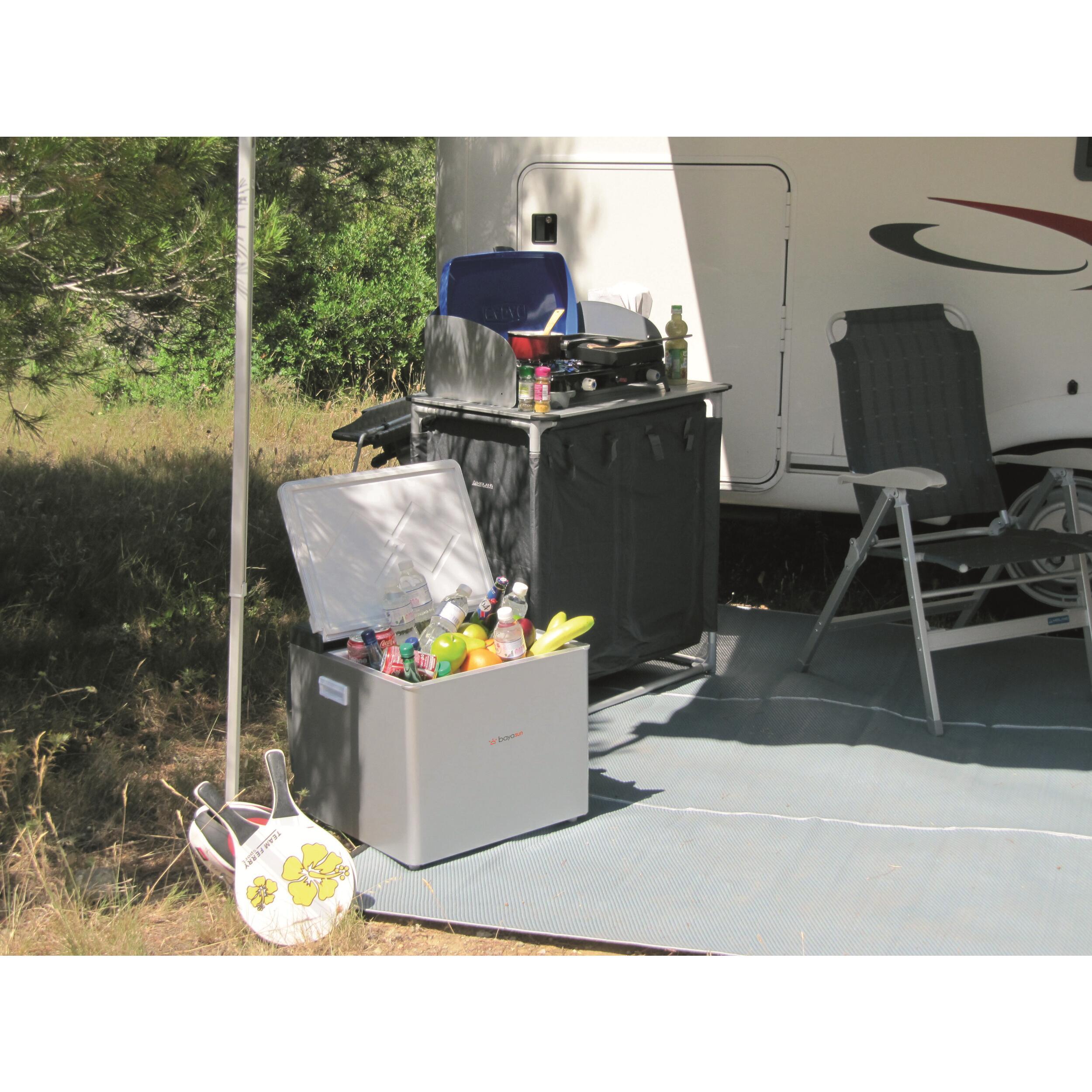 Réfrigérateur portable trimixte à absoption 34 Litres, idéal pour véhicule de loisirs : camping-car, caravane, fourgon aménagé ou pour le camping. Ce réfrigérateur est utilisable dans un véhicule de loisirs en 12 Volts lorsqu'il est en route. Ce réfrigérateur portable est idéal en complément, sous un auvent par exemple ou pour les petits véhicules dépourvus de réfrigérateur fixe. Facile à déplacer grâce à ses poignées intégrées vous pourrez l'installer où bon vous semble en fonction de l'environnement où vous vous trouvez. Vous n'aurez pas à vous poser la question de savoir où le brancher car il a l'avantage de pouvoir fonctionner avec 3 sources d'énergie différentes : gaz, 12 Volts ou 220 Volts. Il peut être utilisé en extérieur avec du gaz ou en 220 Volts. Consommation gaz : 15 g/h. Consommation moyenne : 70 W. Dim. (LxHxP) : 500 x 447 x 490 mm. Poids : 17 kg.