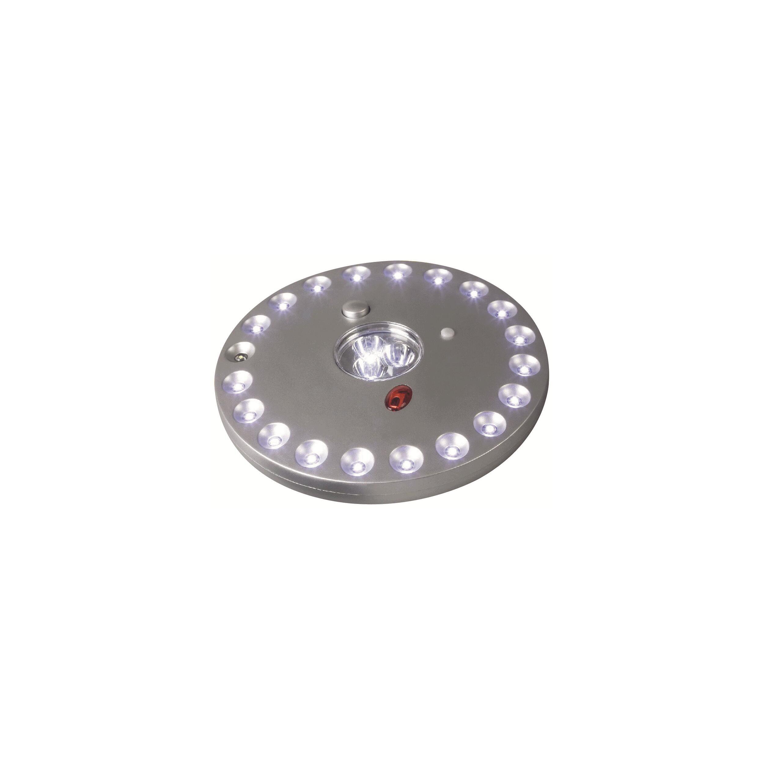 2 modes d’éclairage : 3 leds ou 23 leds. Jusqu’à 20 heures d’autonomie en mode 23 leds. Jusqu’à 120 heures d’autonomie en mode veilleuse 3 leds. Télécommande incluse. Alimentation : 4 piles AA (non fournies)