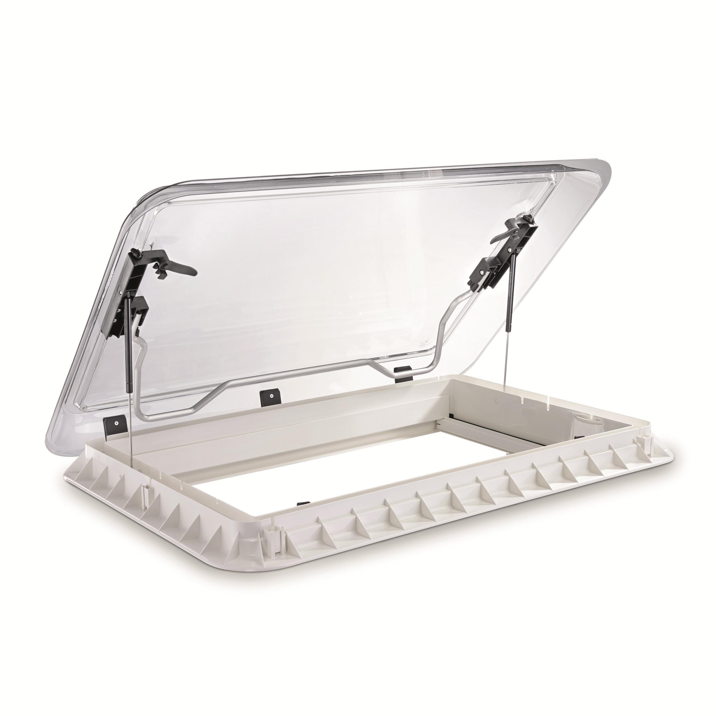 L'ouverture s'effectue facilement grâce à une barre de levage assistée par vérins, permettant un angle d'ouverture maximal de 55°. Il est possible de mettre le maxi lanterneau en position pour une ventilation permanente et profiter d'air frais en continue dans votre caravane.