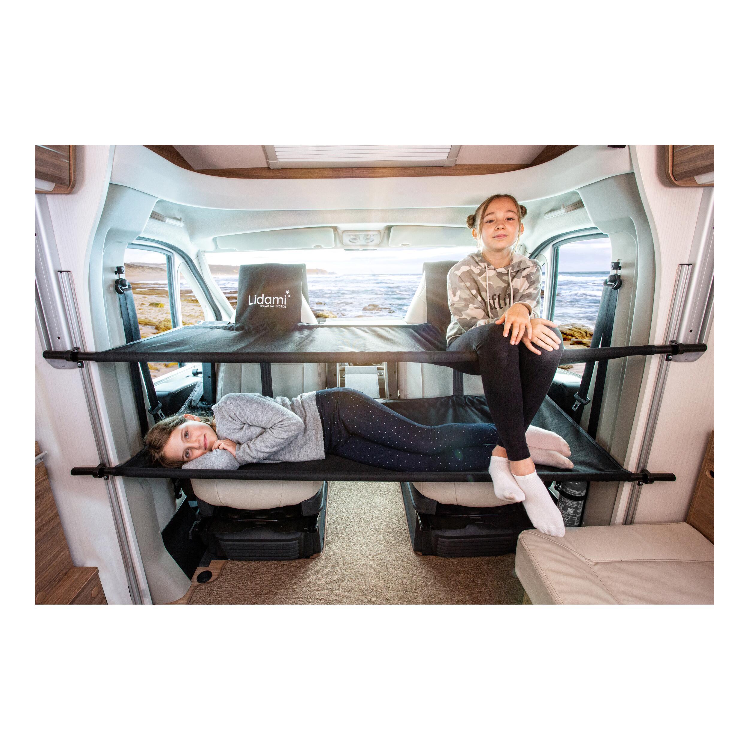 Conçu pour être installé sur les sièges avant pivotants, ce lit superposé utilise astucieusement l'appui-tête et le dossier des sièges pour offrir des places de couchage supplémentaires à votre camping-car. Lidami propose un système breveté où les deux lits se déploient facilement sans nécessiter de perçage.