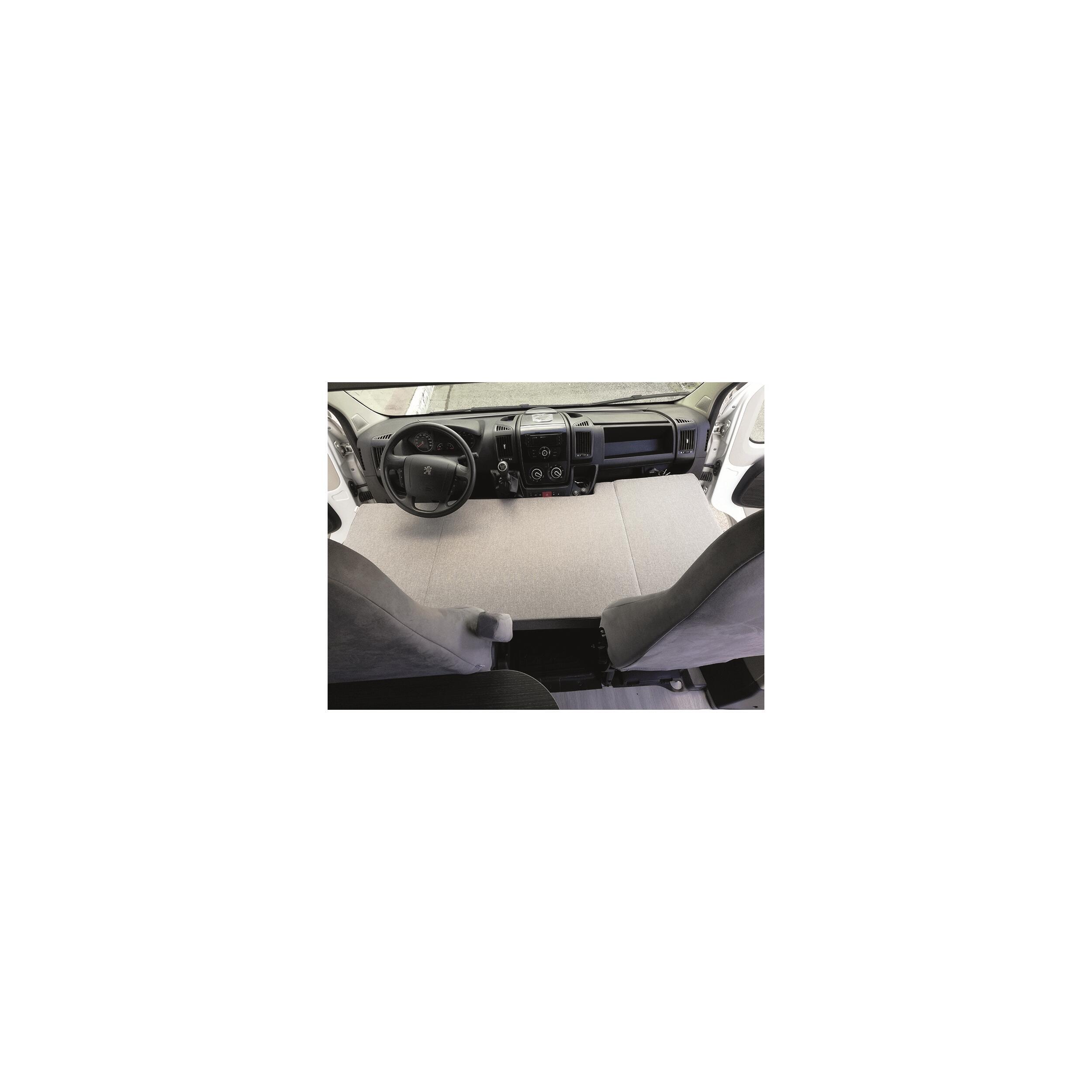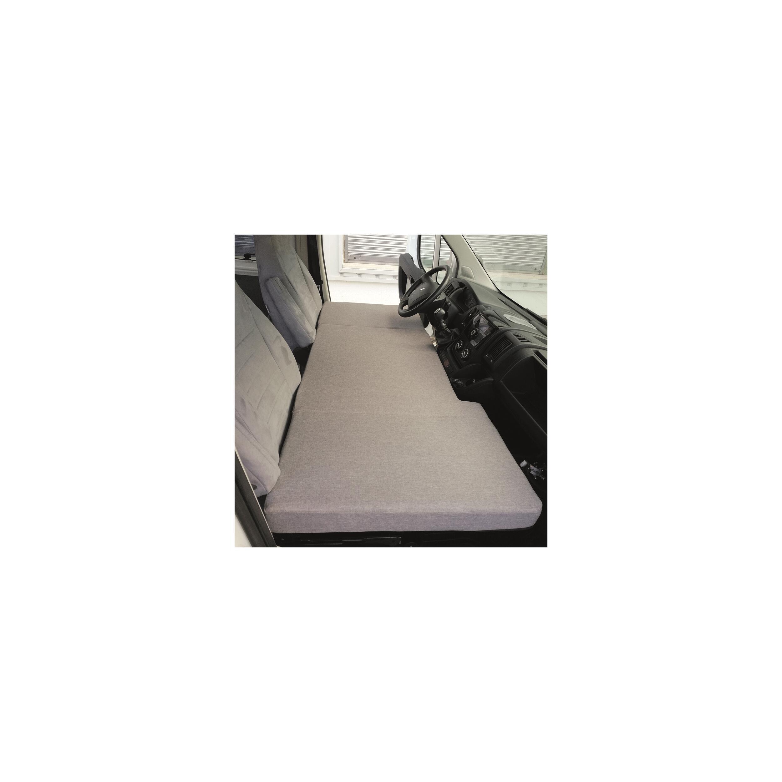 Lits pour cabine camping-car/van, type campsleep. Ce lit cabine Campsleep vous permettra de bénéficier d’un lit d’appoint dans vos escapades, en toute facilité et simplicité. Il s’installe très facilement sur les sièges avant du véhicule. Son système de pliage simple, en 3 éléments, le rend très pratique dans l'utilisation et le rangement quotidien. Il offre un très bon confort avec son matelas de 7 cm d'épaisseur et sa dureté de 25Kg/m3. Equipé de fermeture à zip les housses sont amovibles et lavables.
