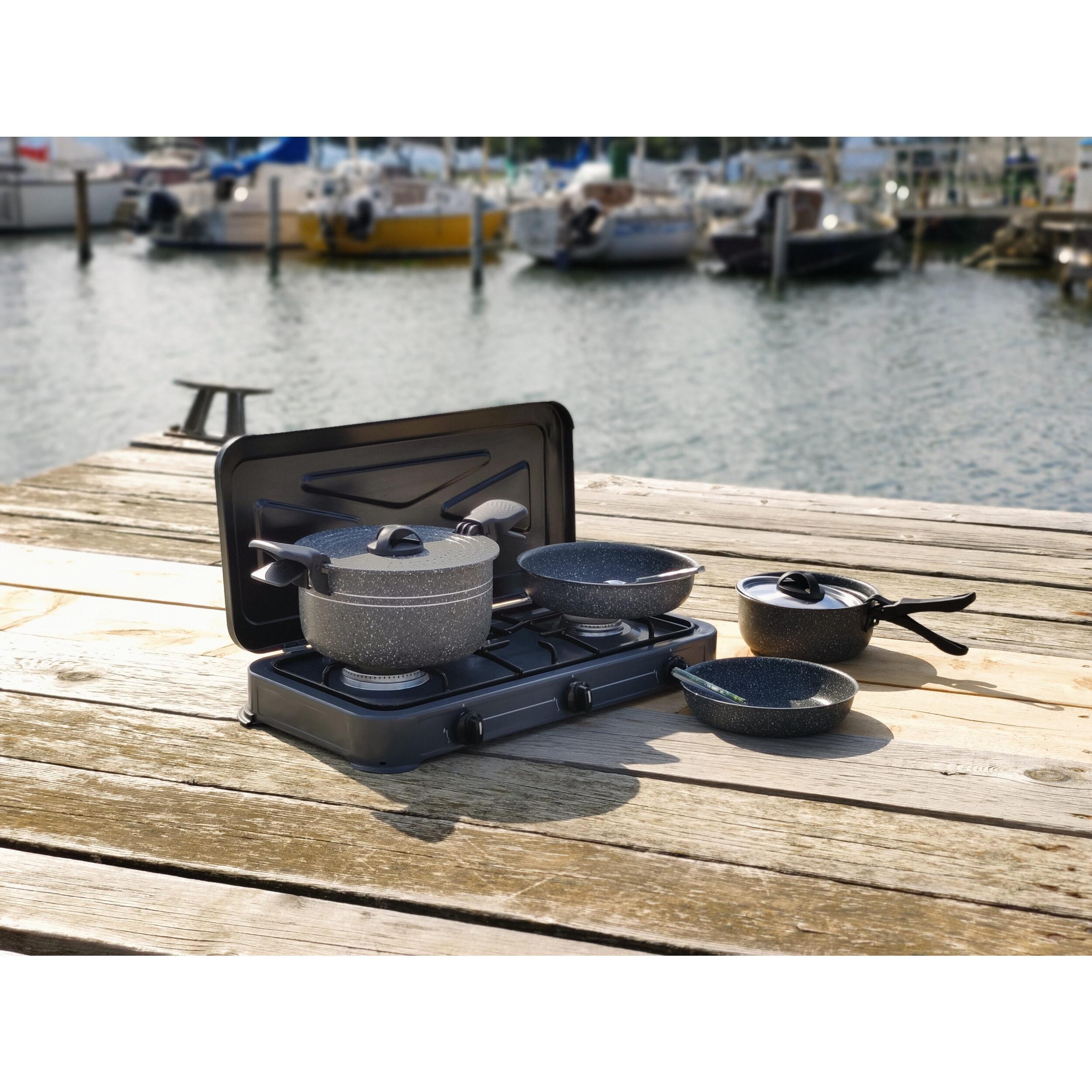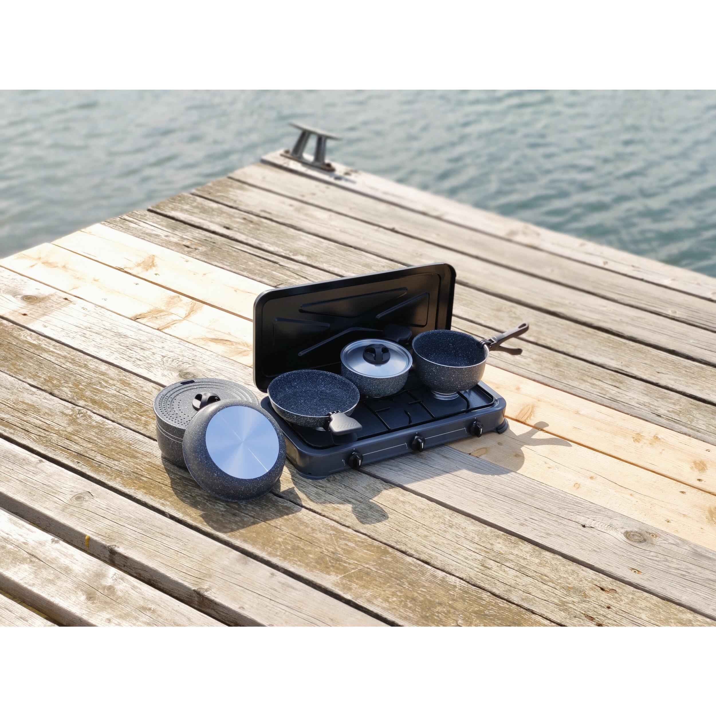 La popoterassemble tout le nécessaire pour cuisiner de bons plats à partager en famille ou entre amis pendant vos voyages. De plus, chaque élément s'emboîte pour former une seule pièce à ranger dans la housse de transport. Pratique !