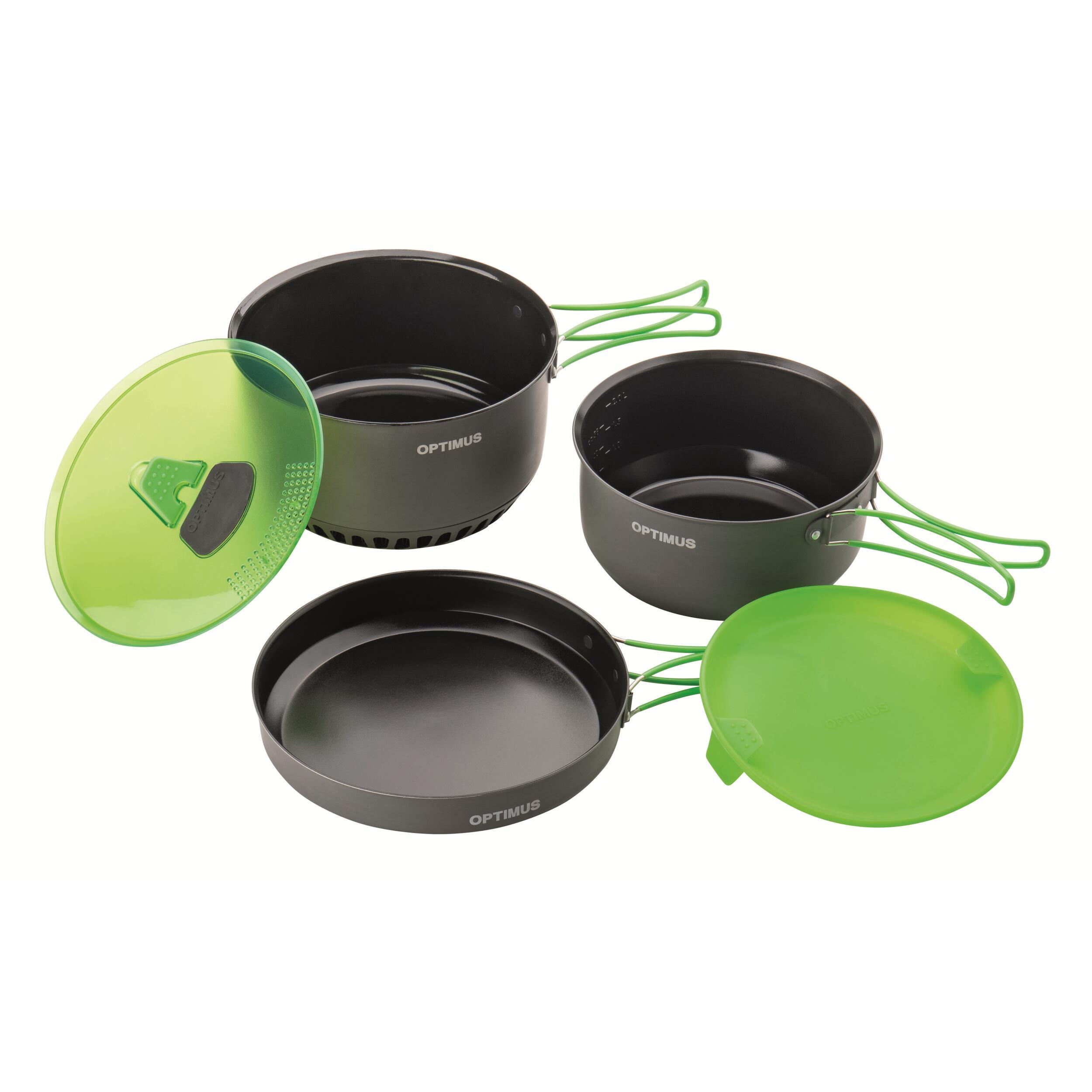 La popote Optimus, selon le modèle,est un ensemble de 3 ou 7 pièces dont le corps de chaque pièce est en aluminium anodisé.