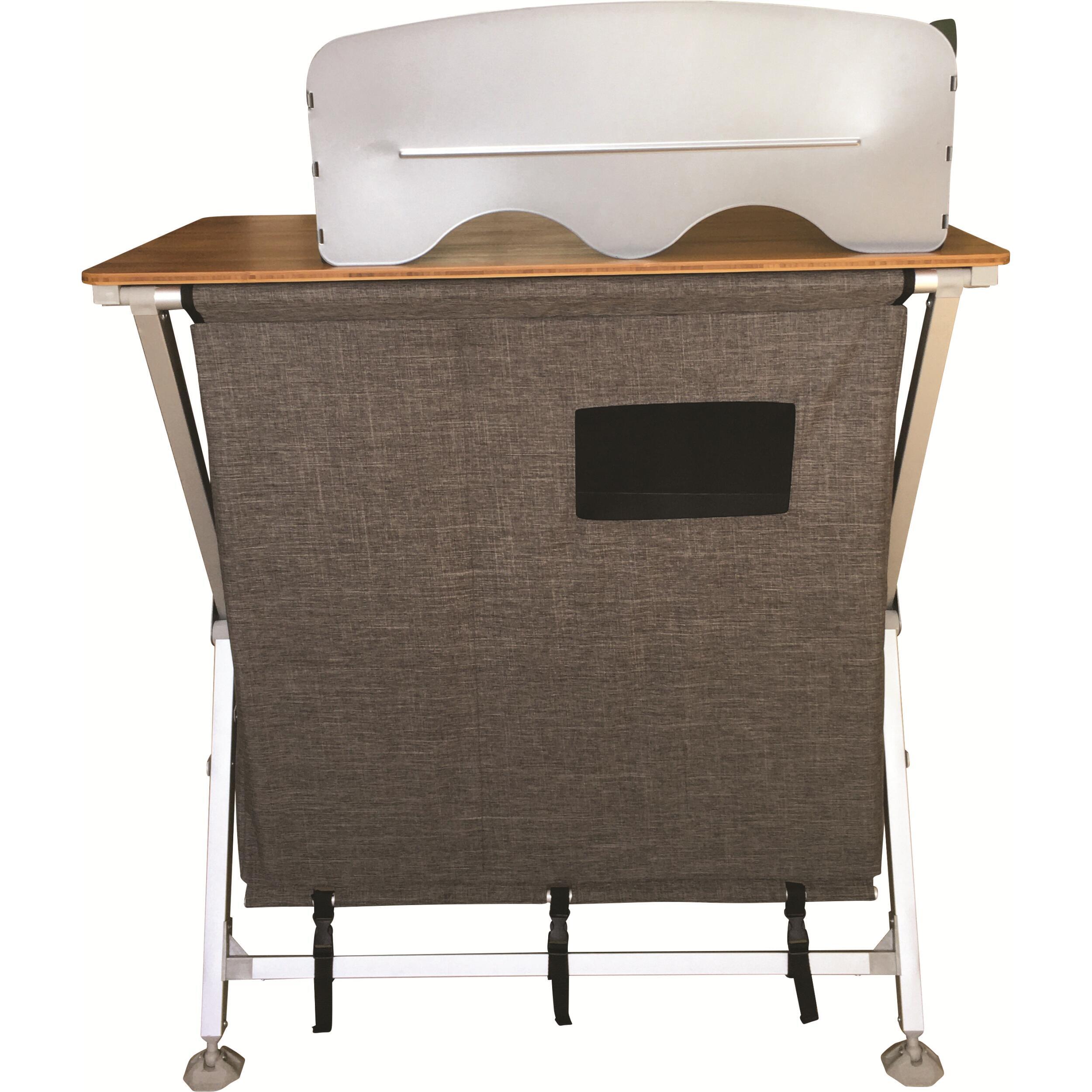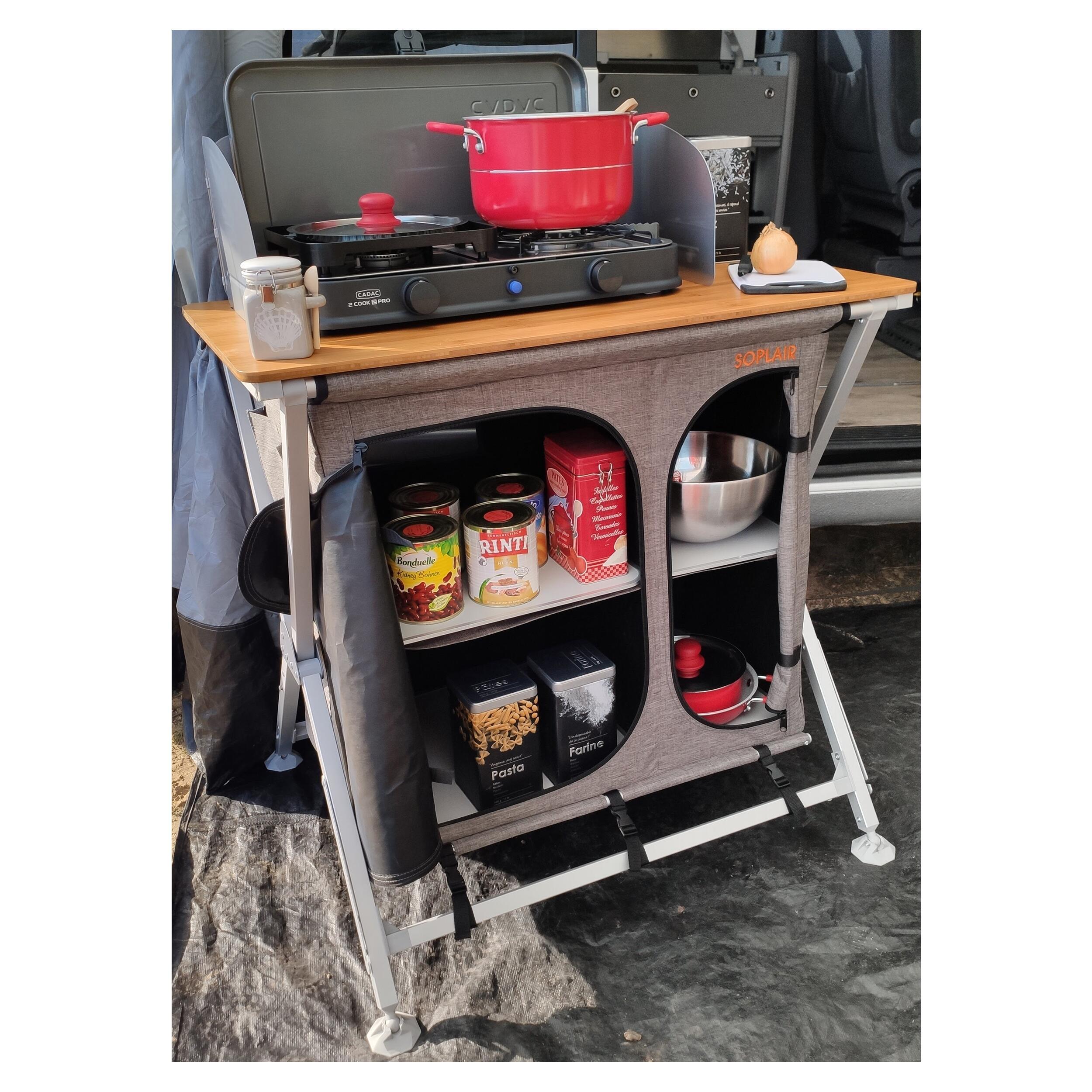 Pour cuisiner de bons plats chauds, vous pouvez utiliser un réchaud de camping à poser sur le plan de travail du meuble. Il peut supporter une charge maximum de 30 kg! Vous pouvez y ranger vos ustensiles de cuisine sur les étagères, car il sert également de meuble de rangement.