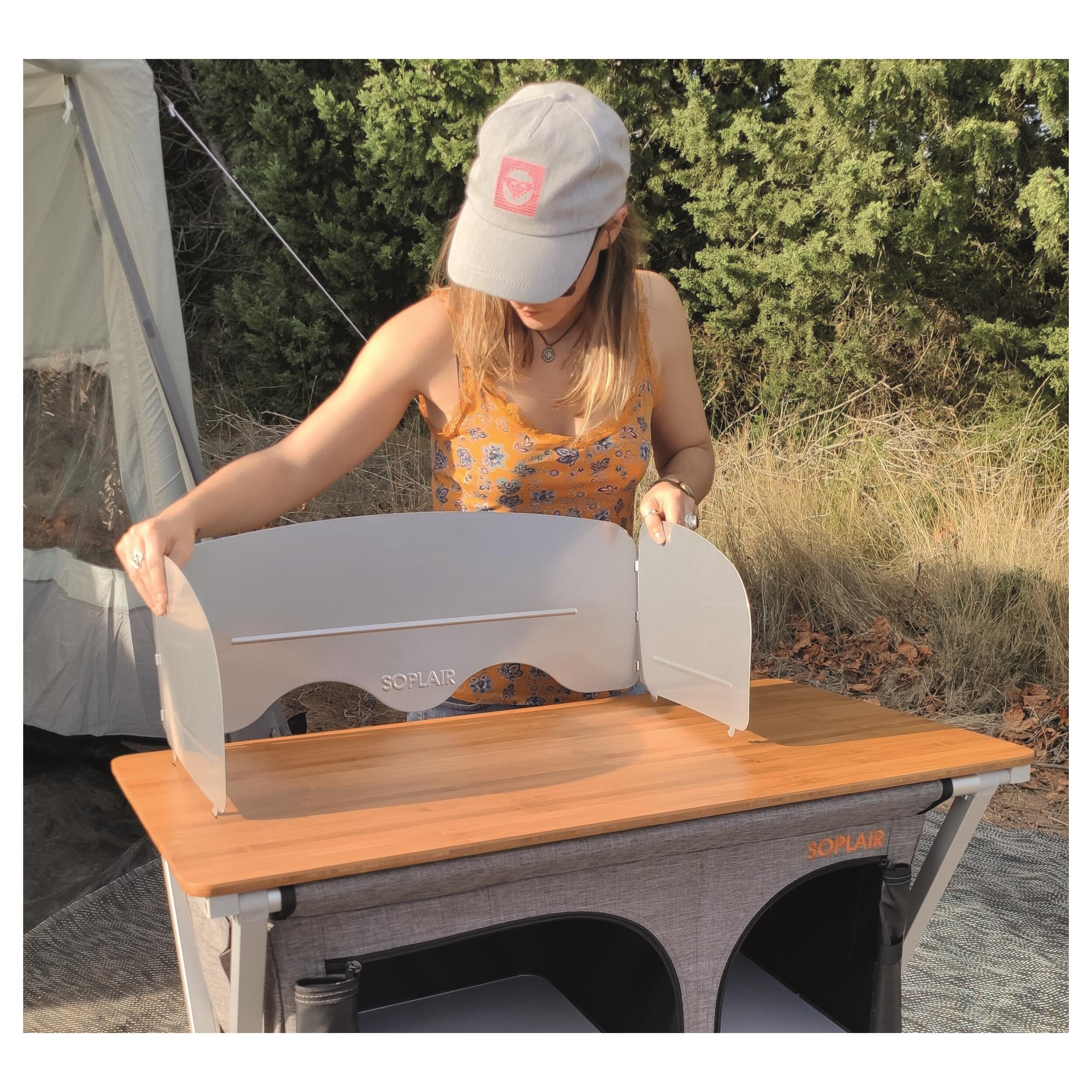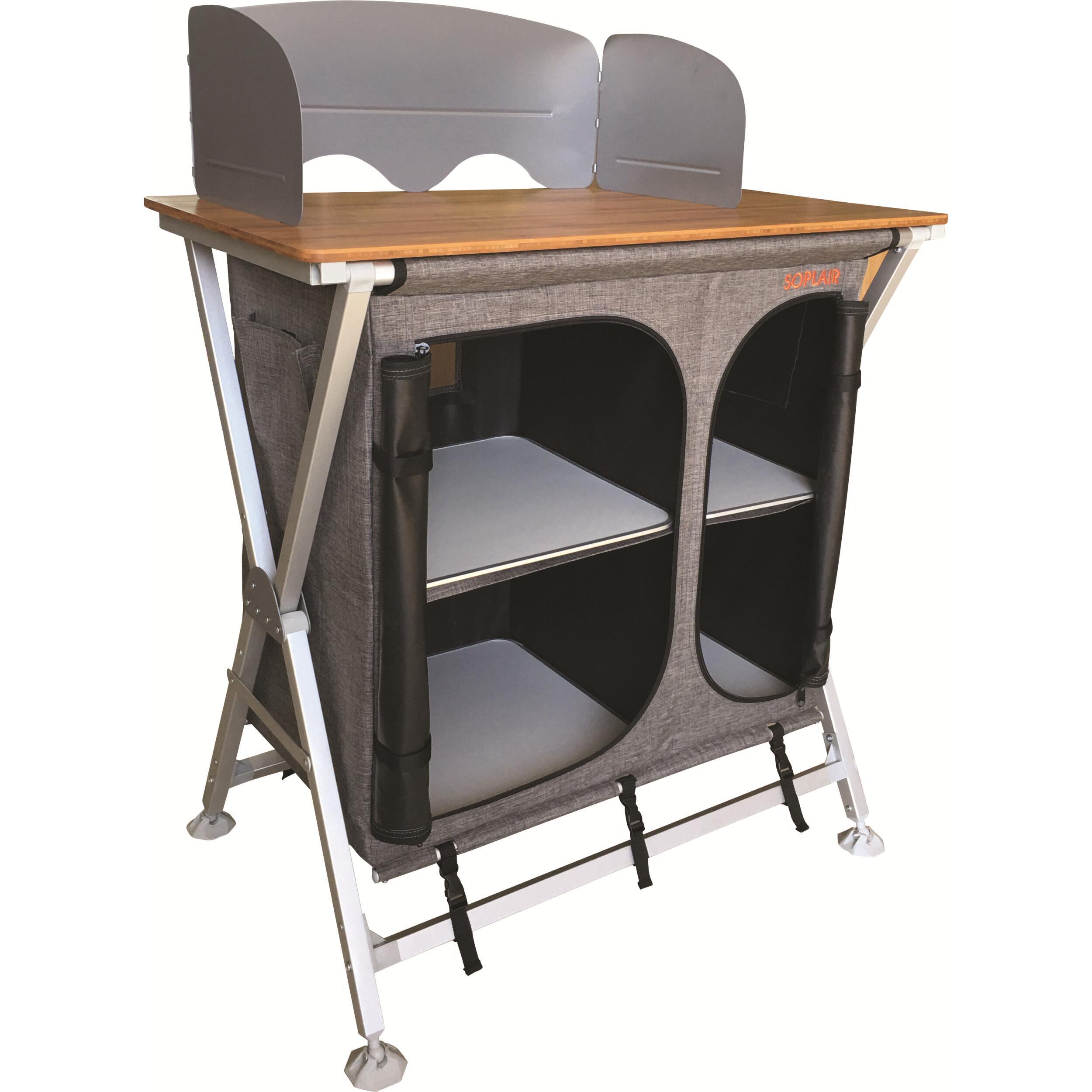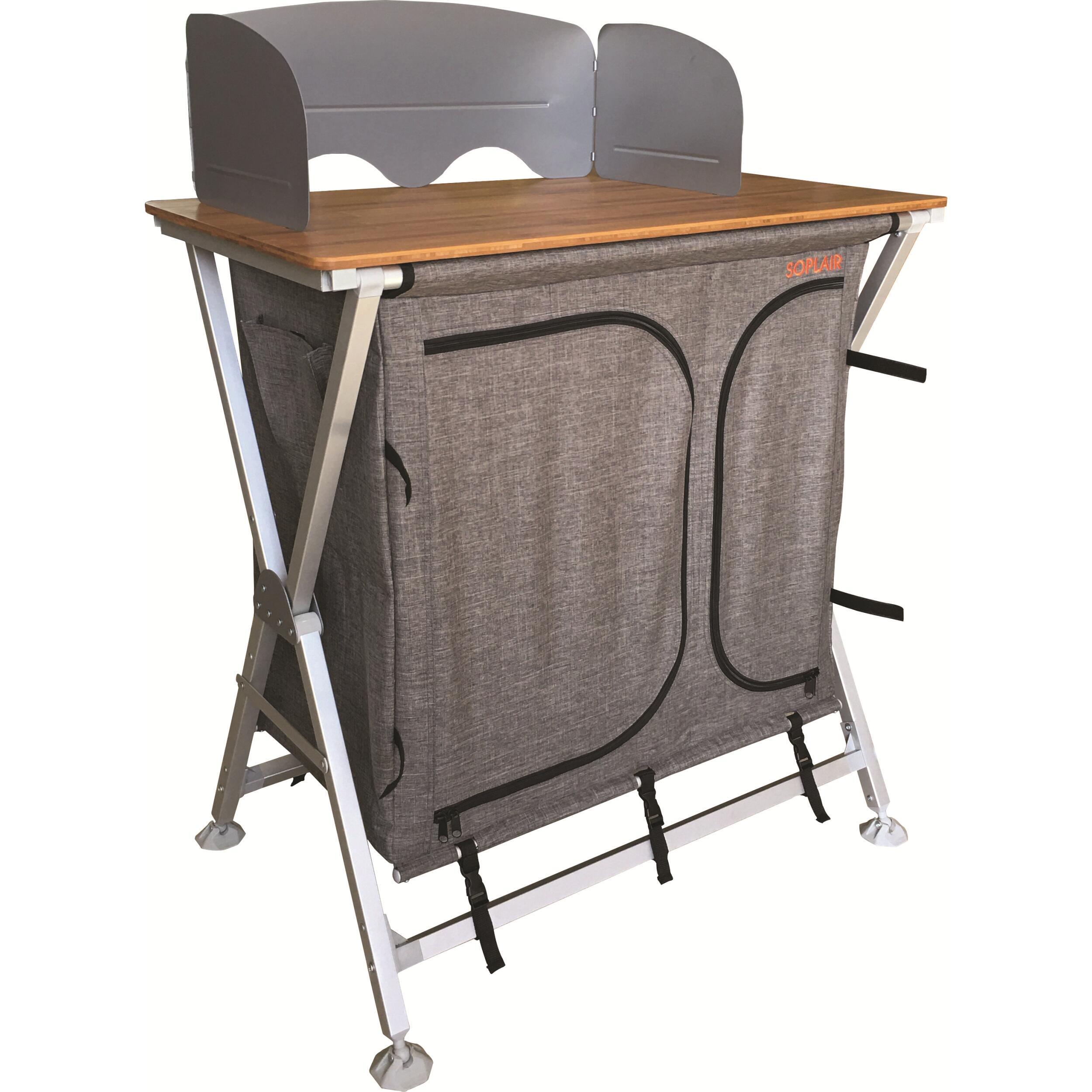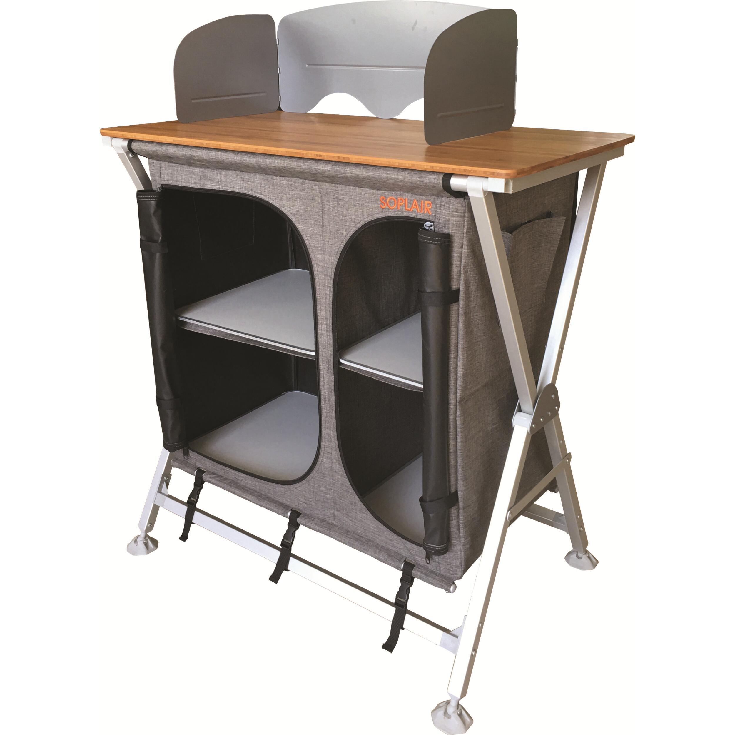 Le meuble de camping cuisine Fidji de la marque Soplair se monte et se plie très rapide à l’aide du système de pliage en équerre rapide. Un système qui assure une sécurité optimale. Il est très compact! Ainsi, vous pouvez voyager avec le meuble de cuisine dans son sac de transport inclus rangés dans le coffre ou la soute de votre véhicule de loisirs (camping-car, van, caravane, fourgon aménagé…).