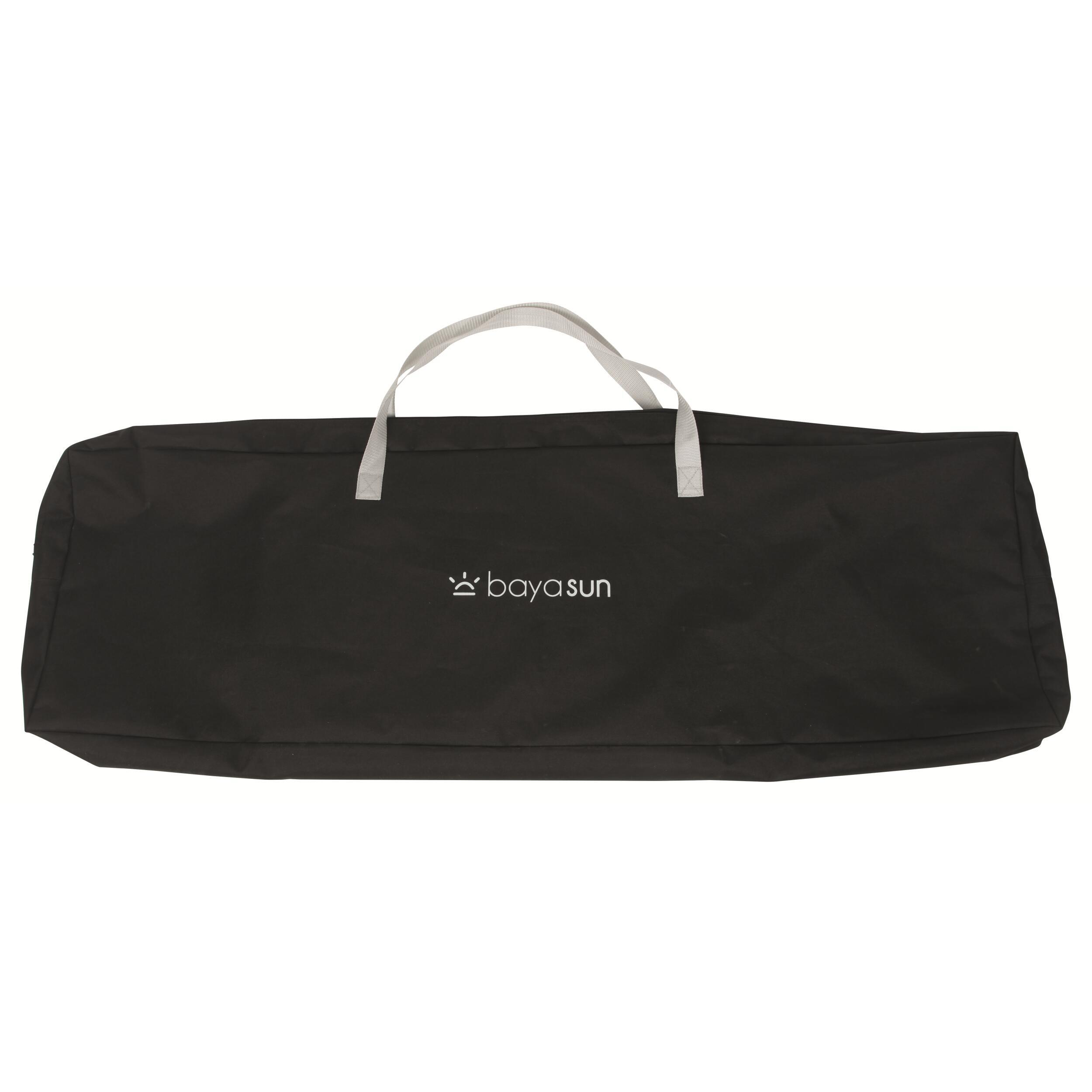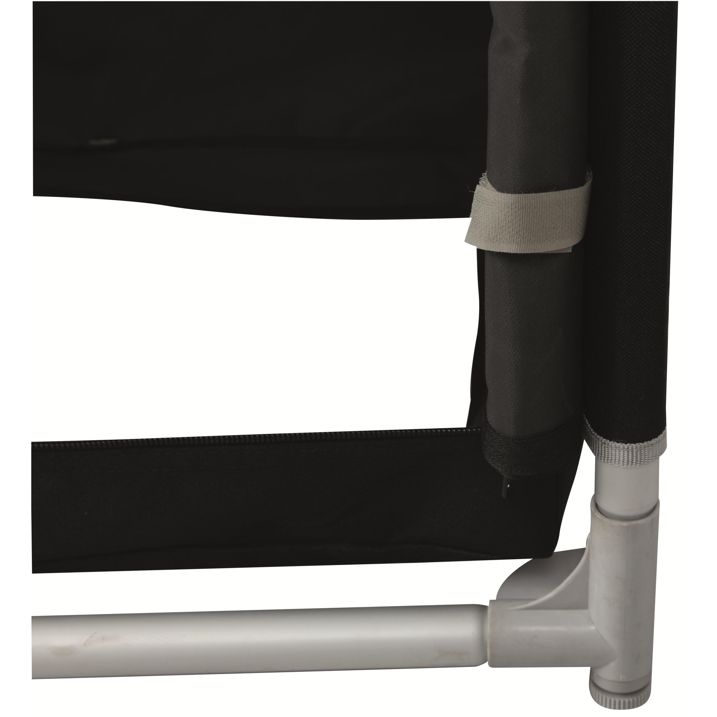 La toile du meuble de camping est en polyester 600D. Quant au plateau, il est fixé par des vis intégrées.