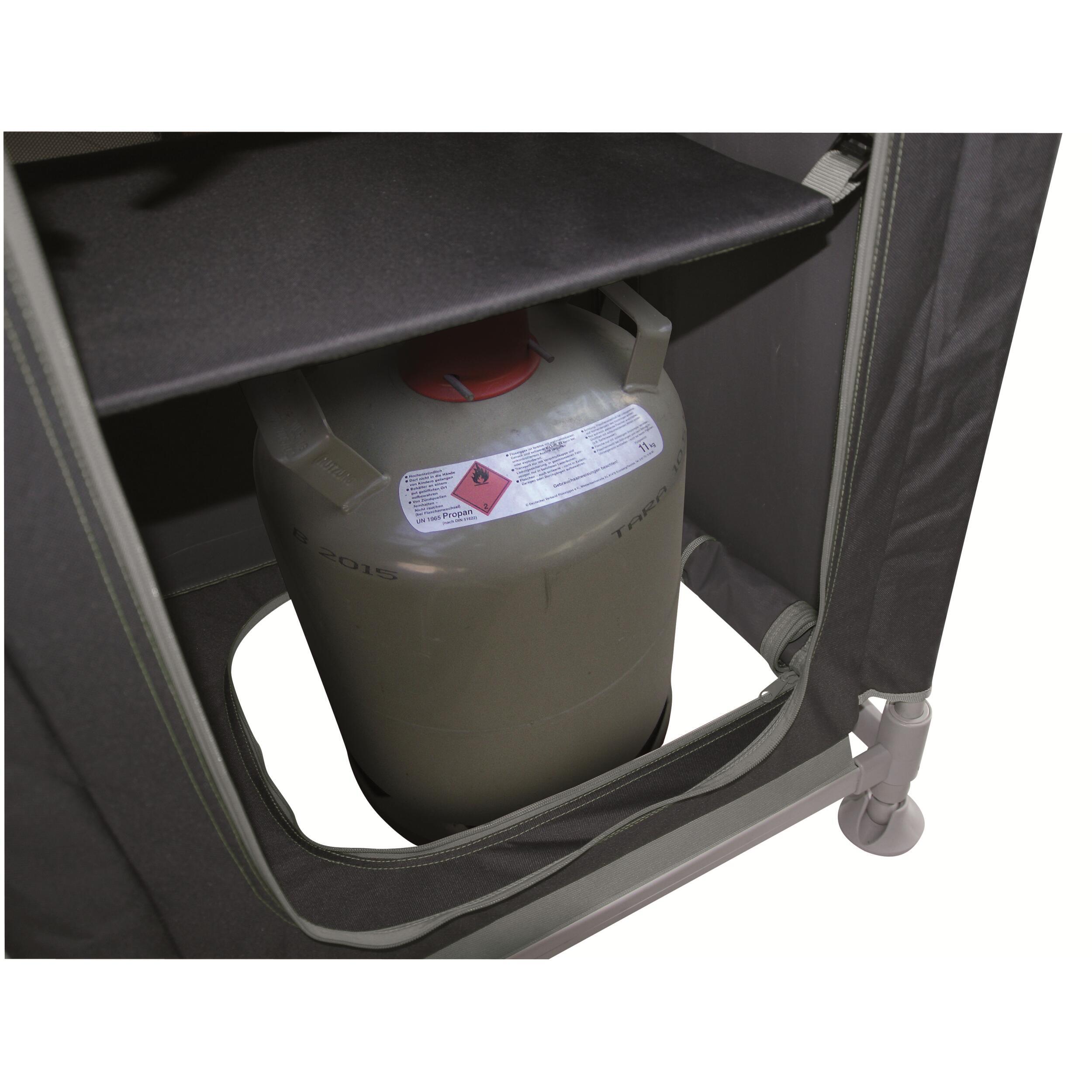 Le meuble extérieur Moducamp double propose de nombreux rangements avec ses 4 étagères. Il dispose aussi d’un emplacement pour évier (non fourni) et d’un emplacement pour ranger une éventuelle bouteille de gaz. Pratique lorsque vous souhaitez utiliser un réchaud de camping!