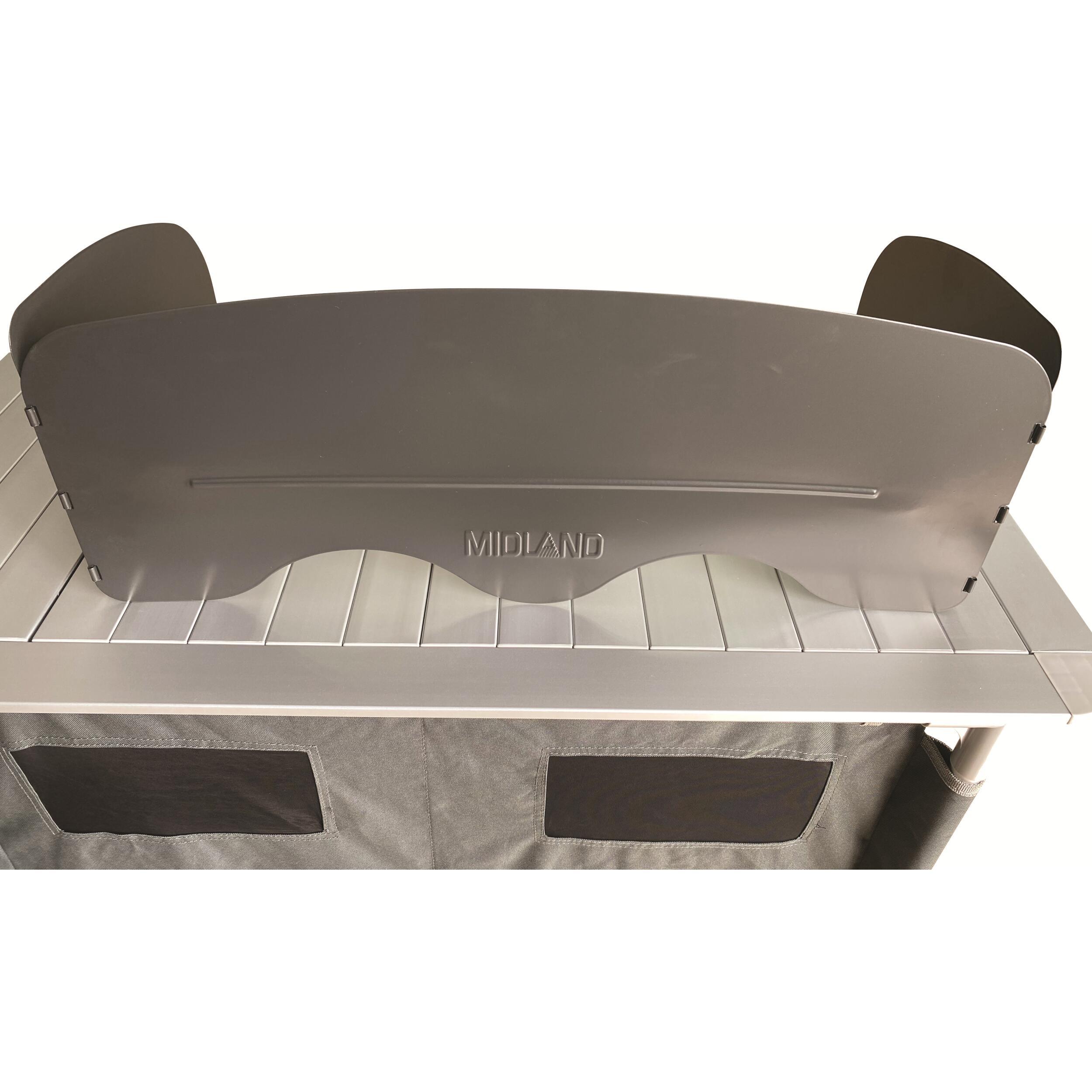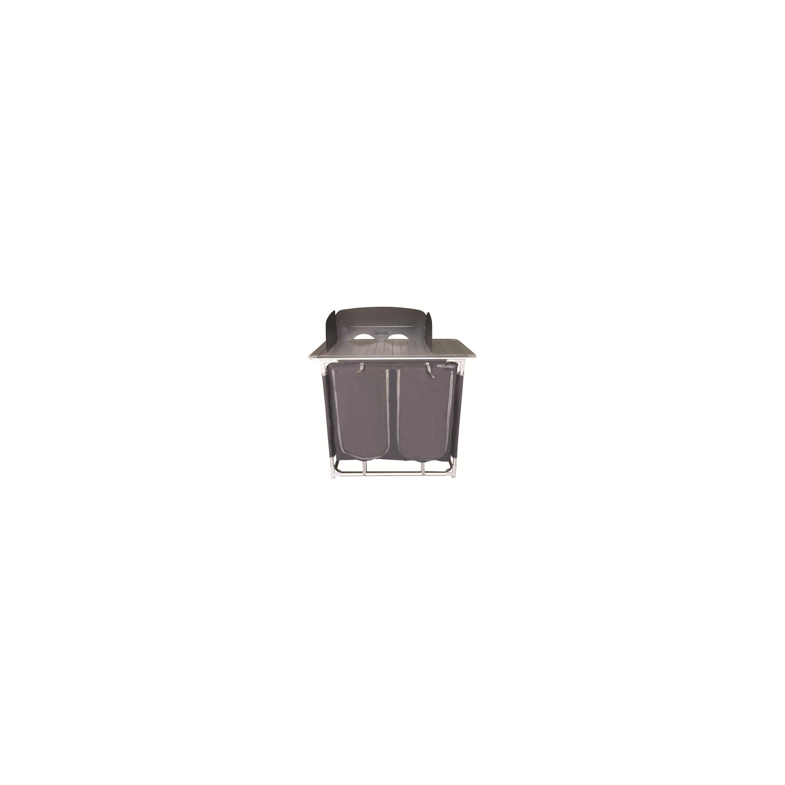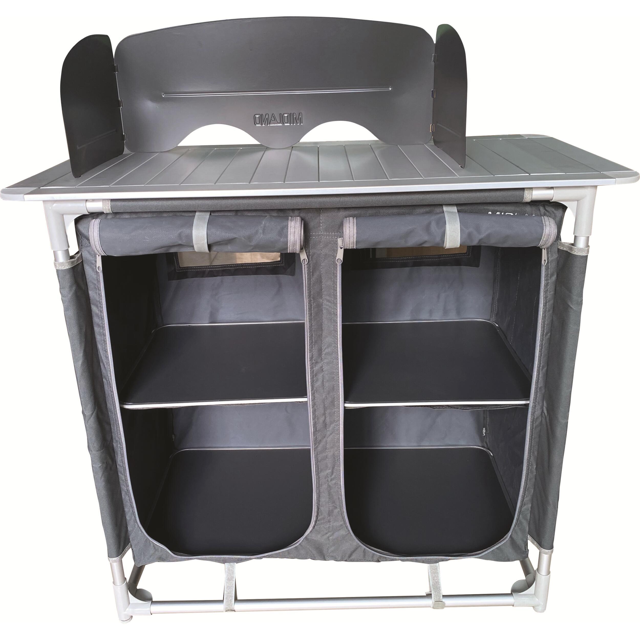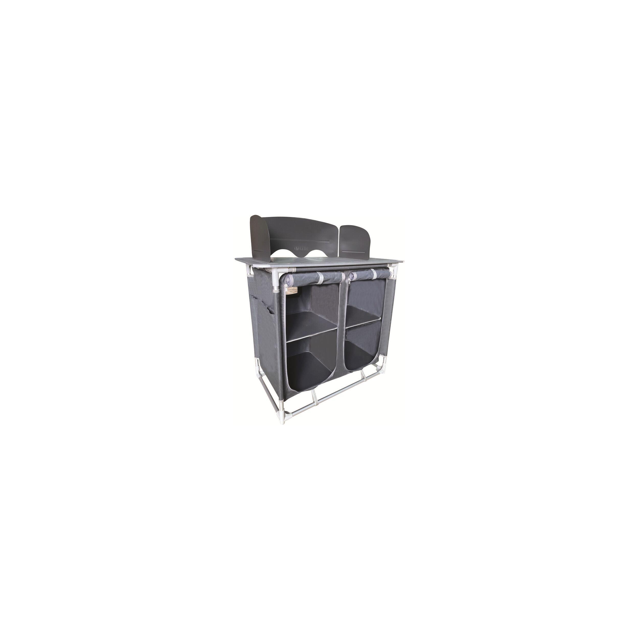 Meuble de cuisine pratique avec 4 espaces de rangement, poches latérales et plan de travail avec pare-flamme. Sa toile aérée en polyester 600D évite l’humidité, et ses pieds réglables assurent une bonne stabilité. Livré avec sac de transport.