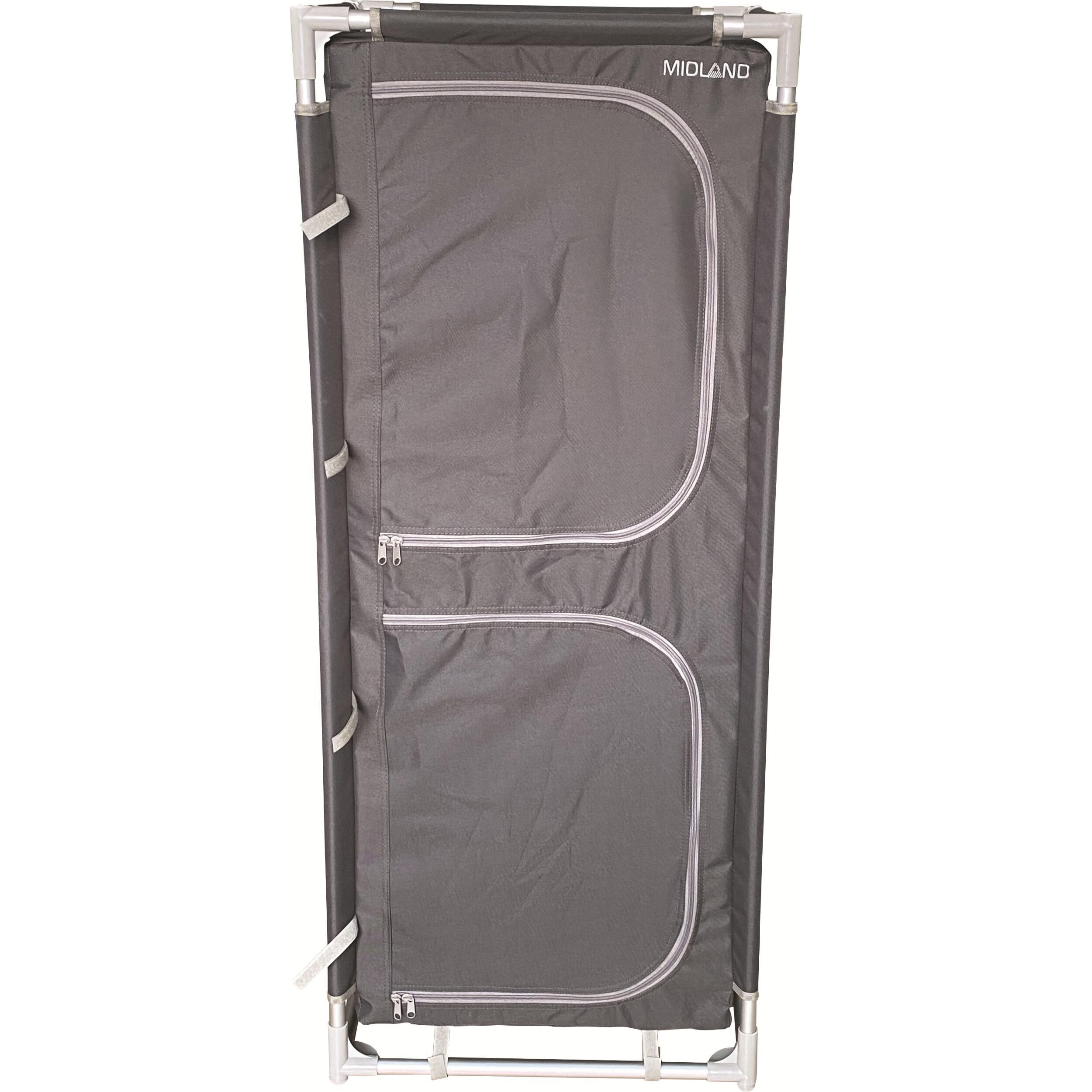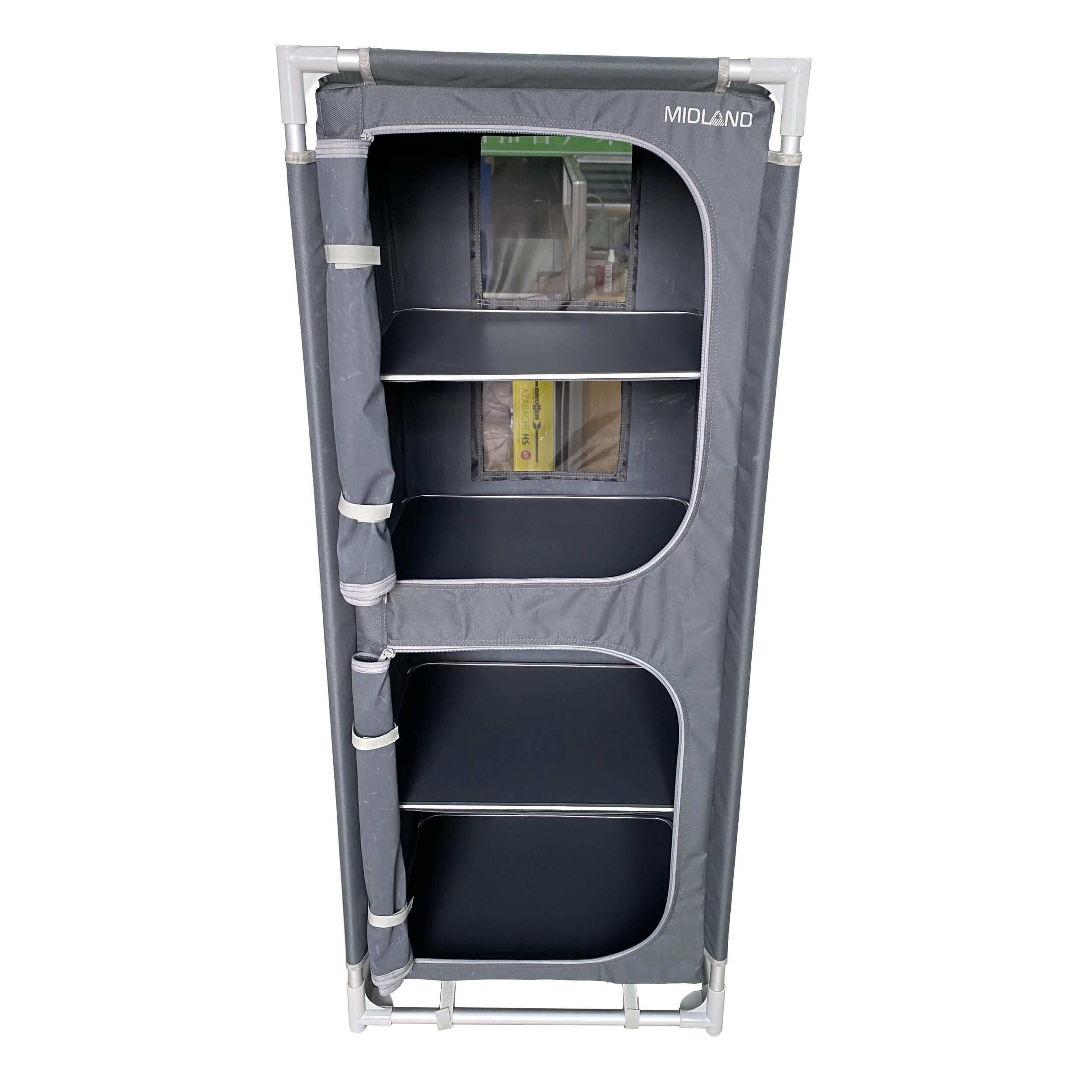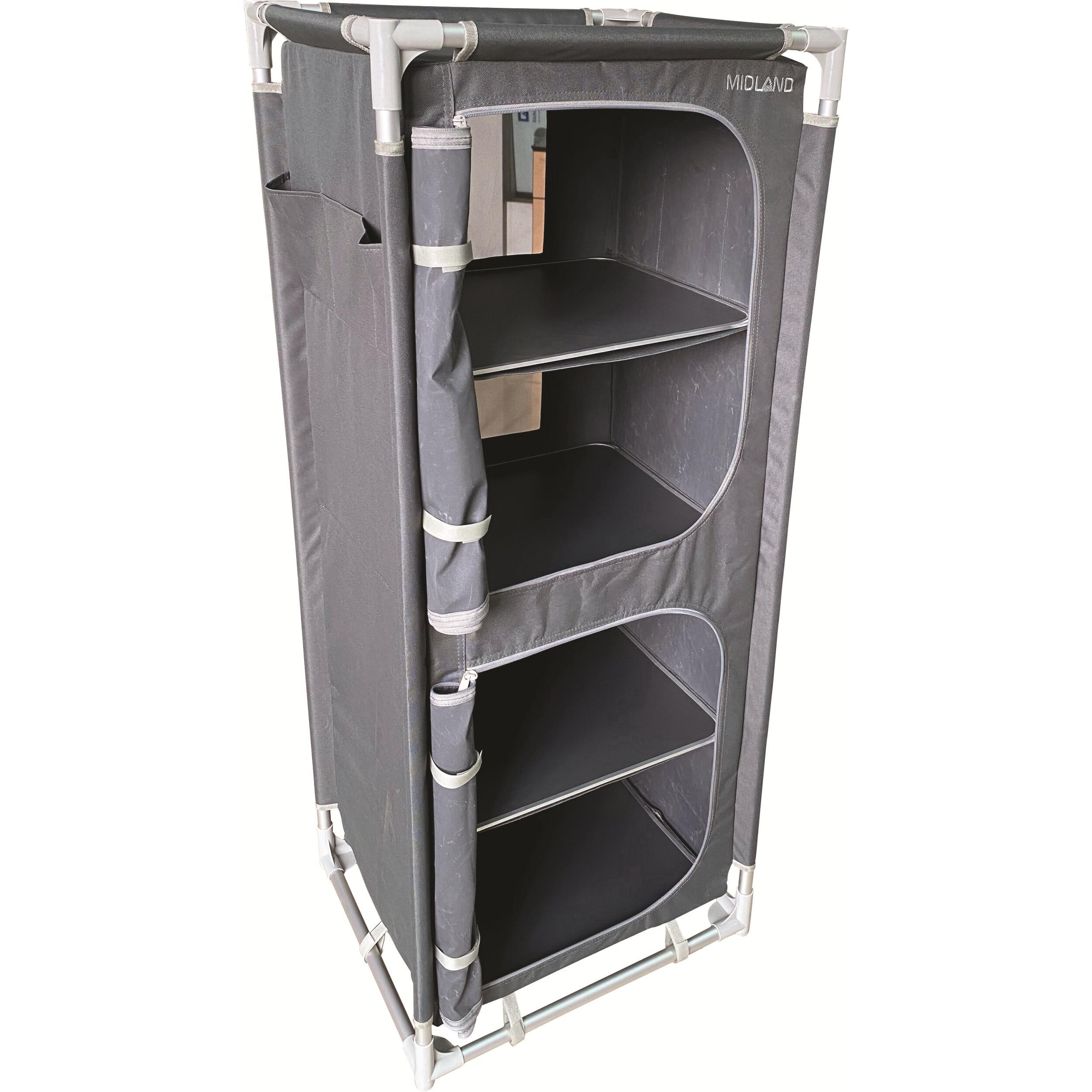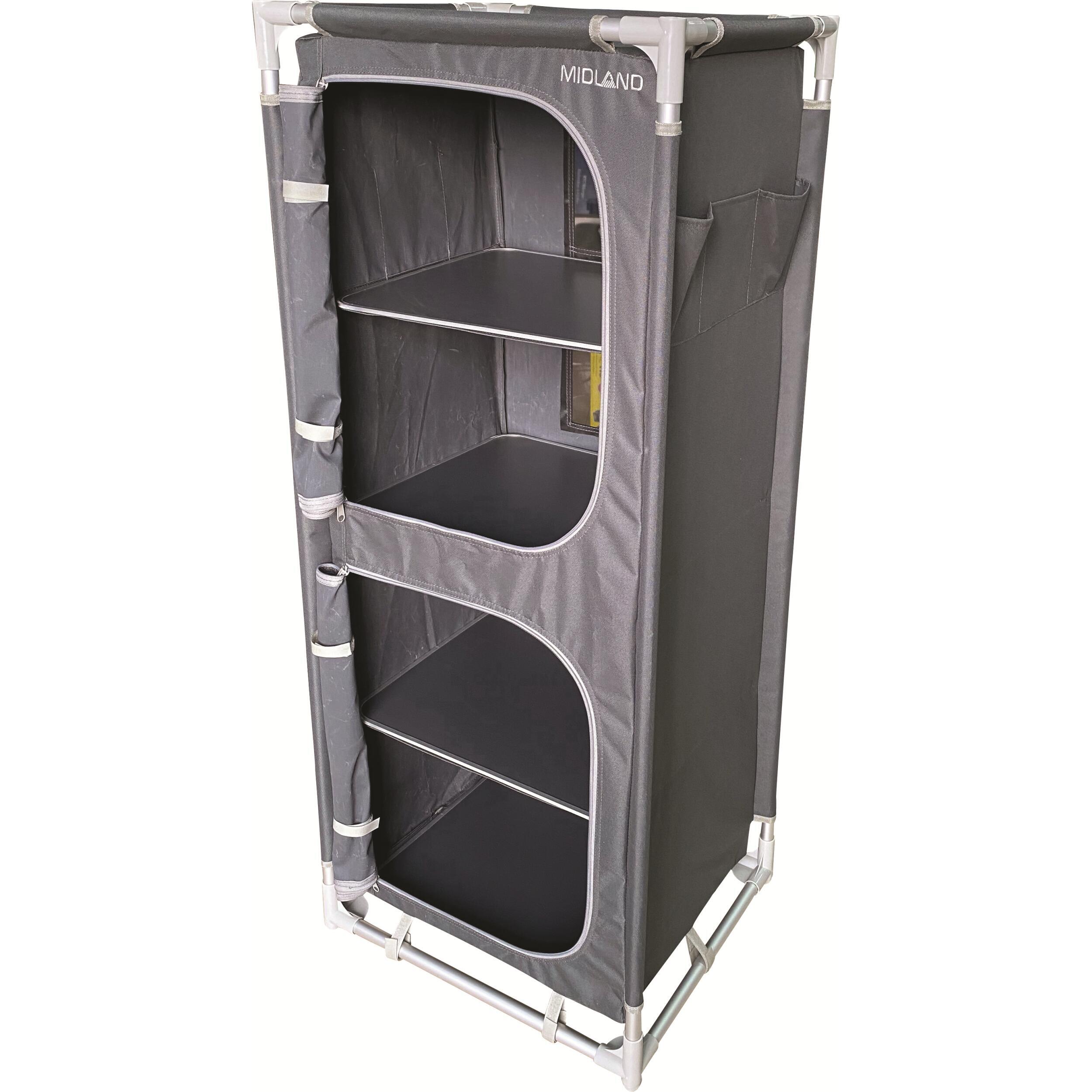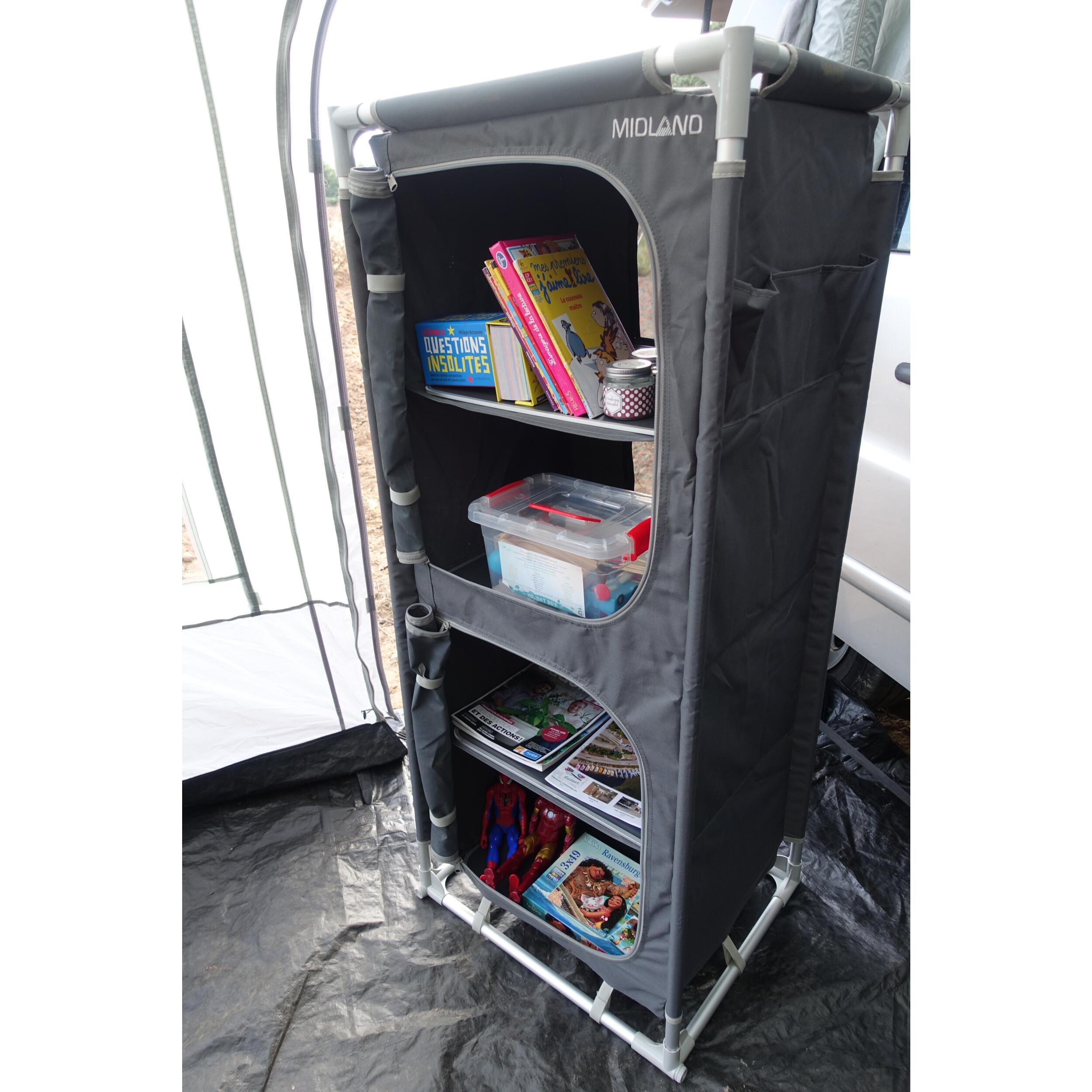Le meuble de rangement Gamma de MIDLAND allie grande capacité et format pliable pour un camping bien organisé. Avec ses 4 étagères, poches latérales, toile aérée et pieds réglables, il offre stabilité, durabilité et confort, même en pleine nature. Sac de transport inclus