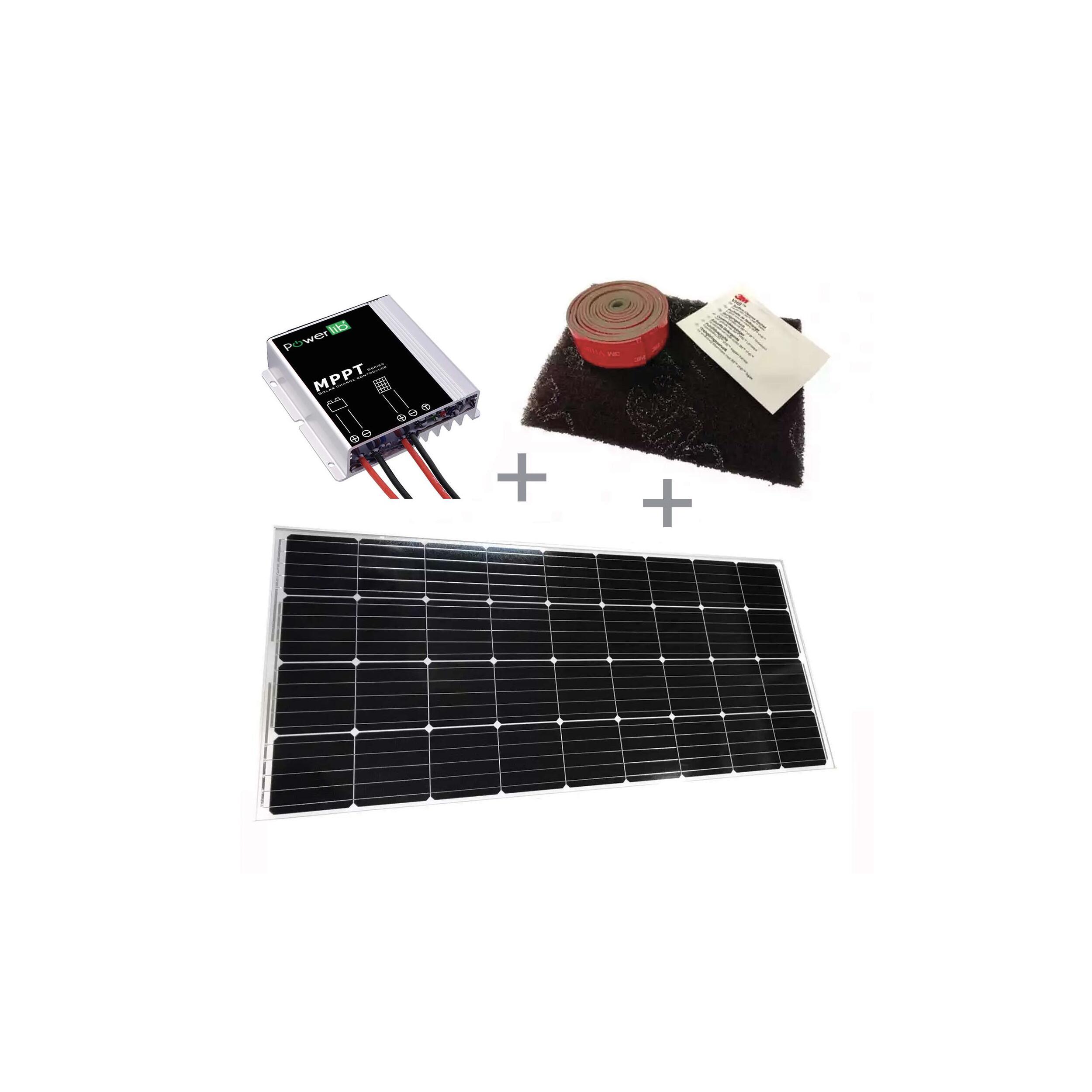 Composition du Pack Panneau solaire E-ssential Flat 200W + Régulateur solaire MPPT 10A + Kit adhésif