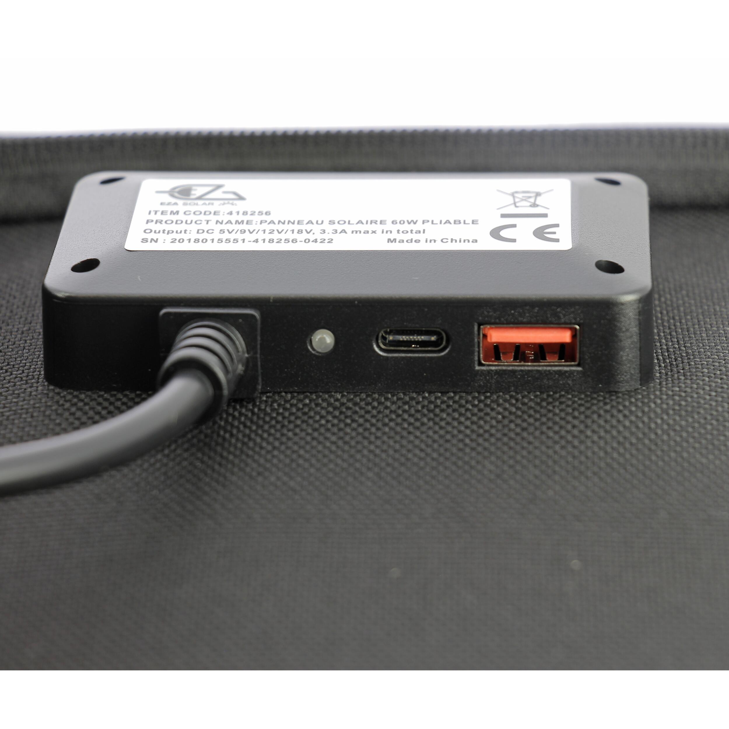 Le panneau solaire pliable 100 w ou 60 w recharge vos appareils et votre batterie auxiliaire via la connectique suivante :