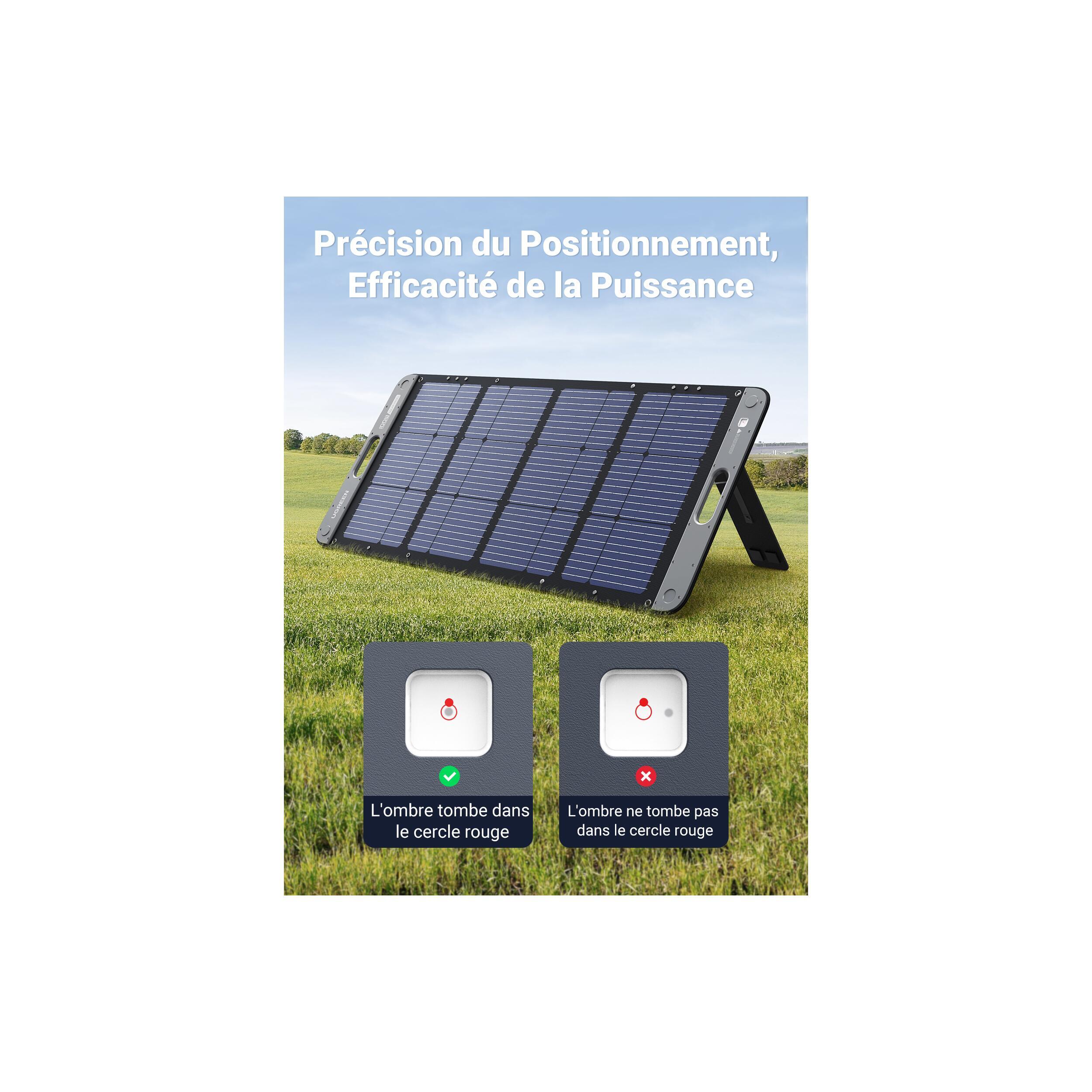 • Ultra-portable et pliable : Léger, compact et muni d’une poignée magnétique, il se transporte comme une mallette. Son support réglable assure le meilleur angle d’ensoleillement.
