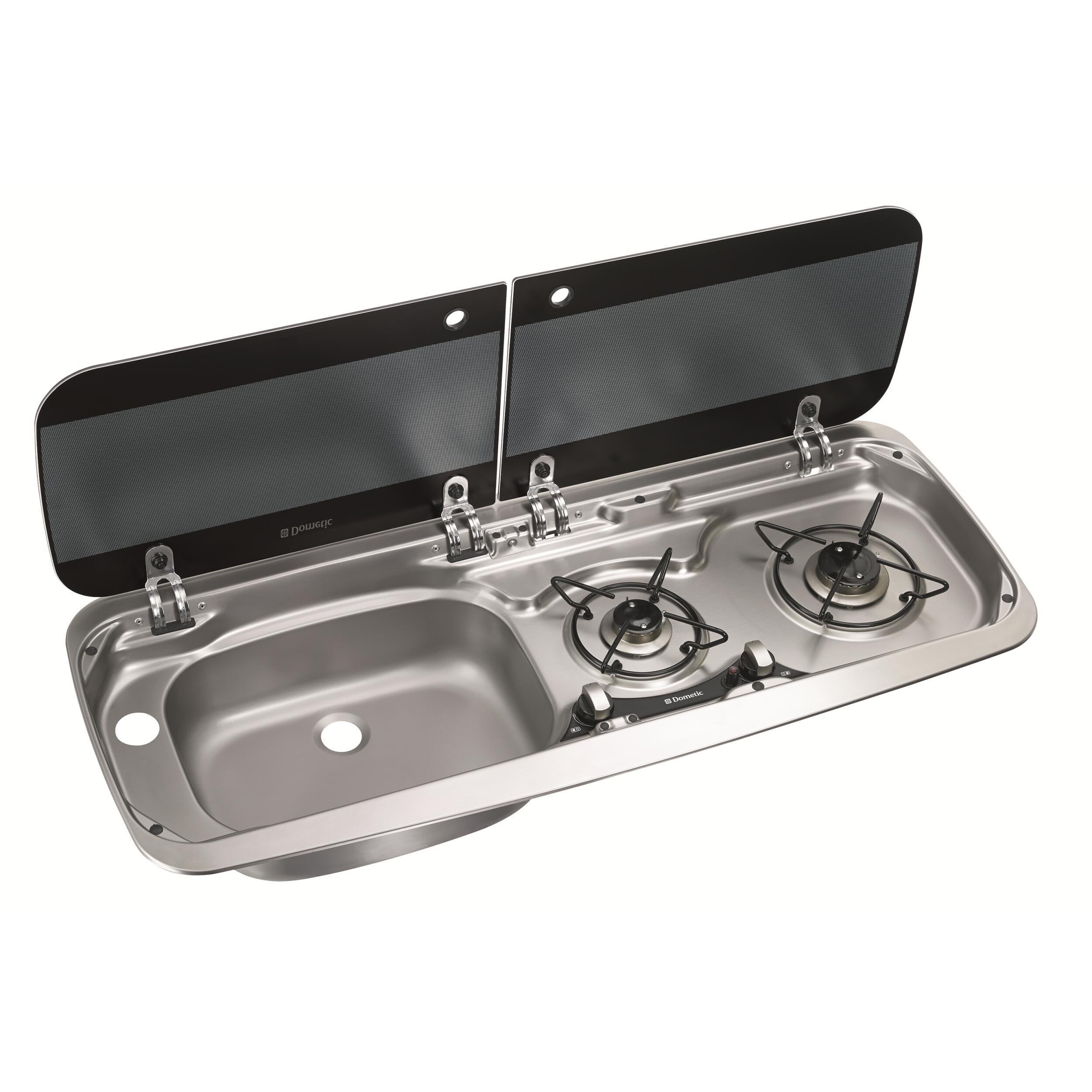 Combiné réchaud et évier en inox avec couvercle en verre trrempé résistant à la chaleur.