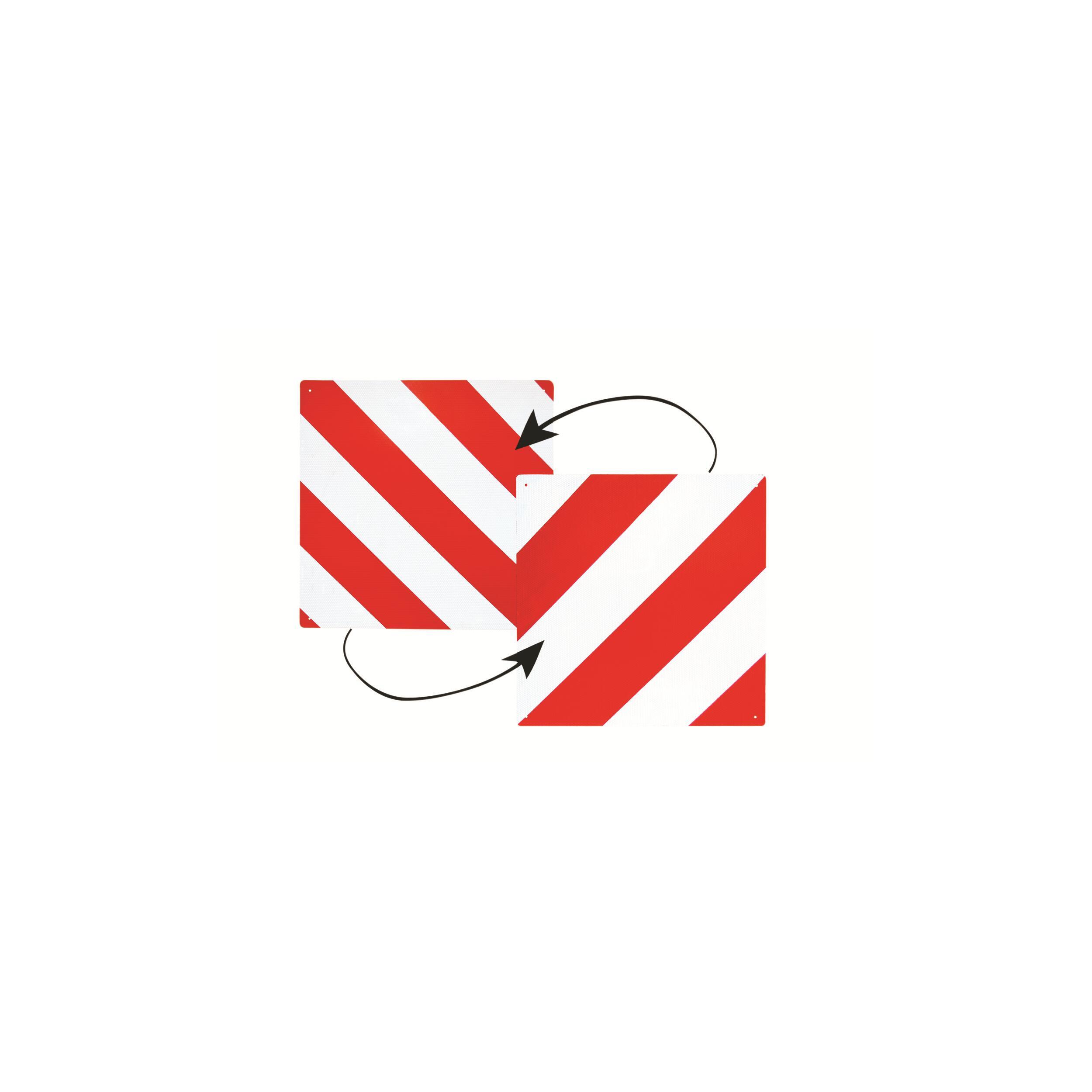 Plaque de signalisation pour chargement arrière de camping-car, pour l'Espagne et l'Italie. Cet accessoire de sécurité pour véhcules de loisirs : camping-car, caravane ou fourgon-aménagé permet de signaler un chargement à l'arrière. Il est par xemple obligatoire en cas de porte-vélos déployé à l'arrière du véhicule. La plaque de signalisation est réversible : coté recto avec 5 bandes réfléchissantes pour l'Italie, coté verso avec 3 bandes réfléchissantes pour l'Espagne. Diemnsions : 500 x 500 mm.