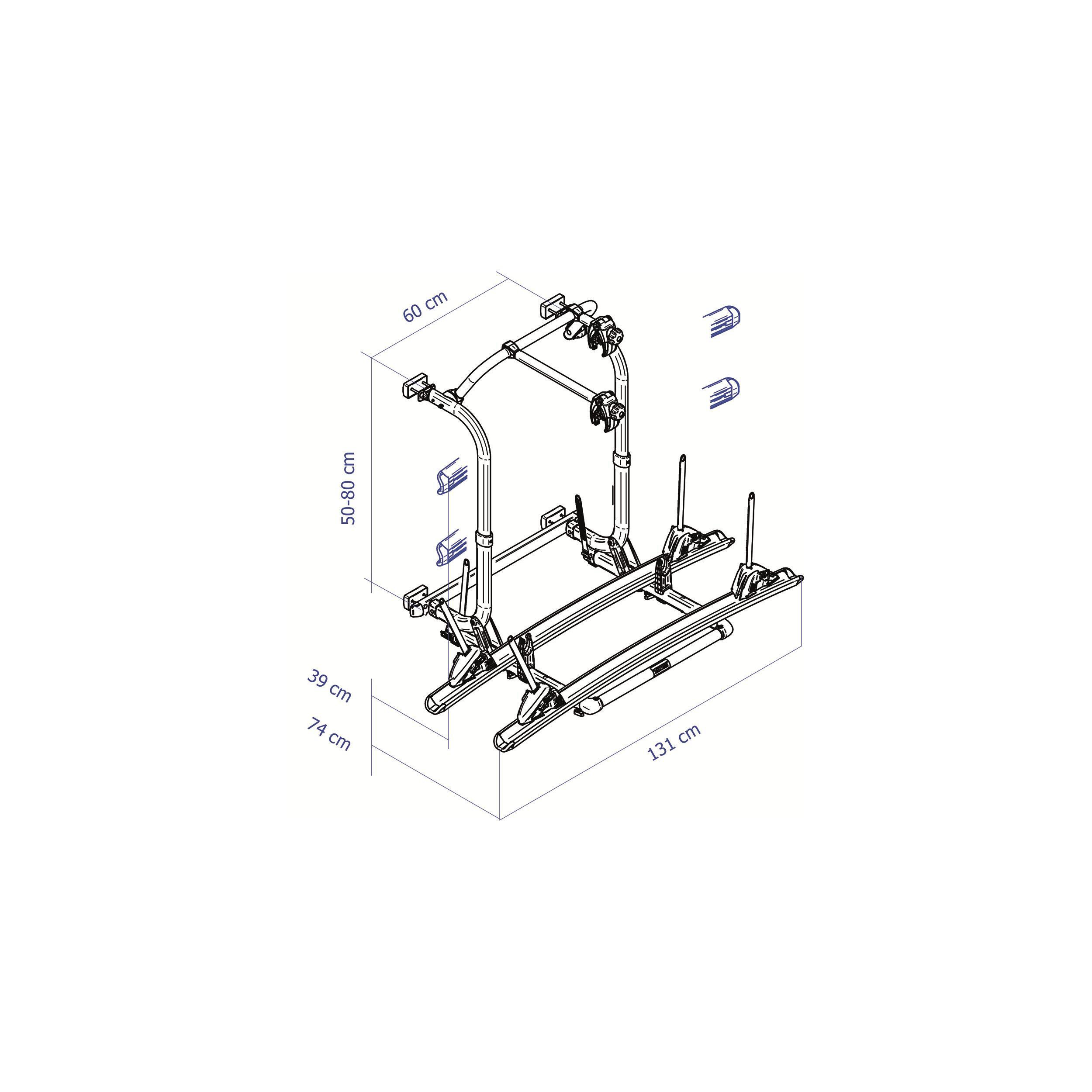 Ce porte-vélos est modulable en hauteur, grâce à ses tubes télescopiques de 80 à 150 cm. La largeur totale est de 131 cm, celle de l'entraxe de fixation de 60 cm et la profondeur de 74 cm. Ces paramètres sont à vérifier sur votre véhicule avant tout achat.