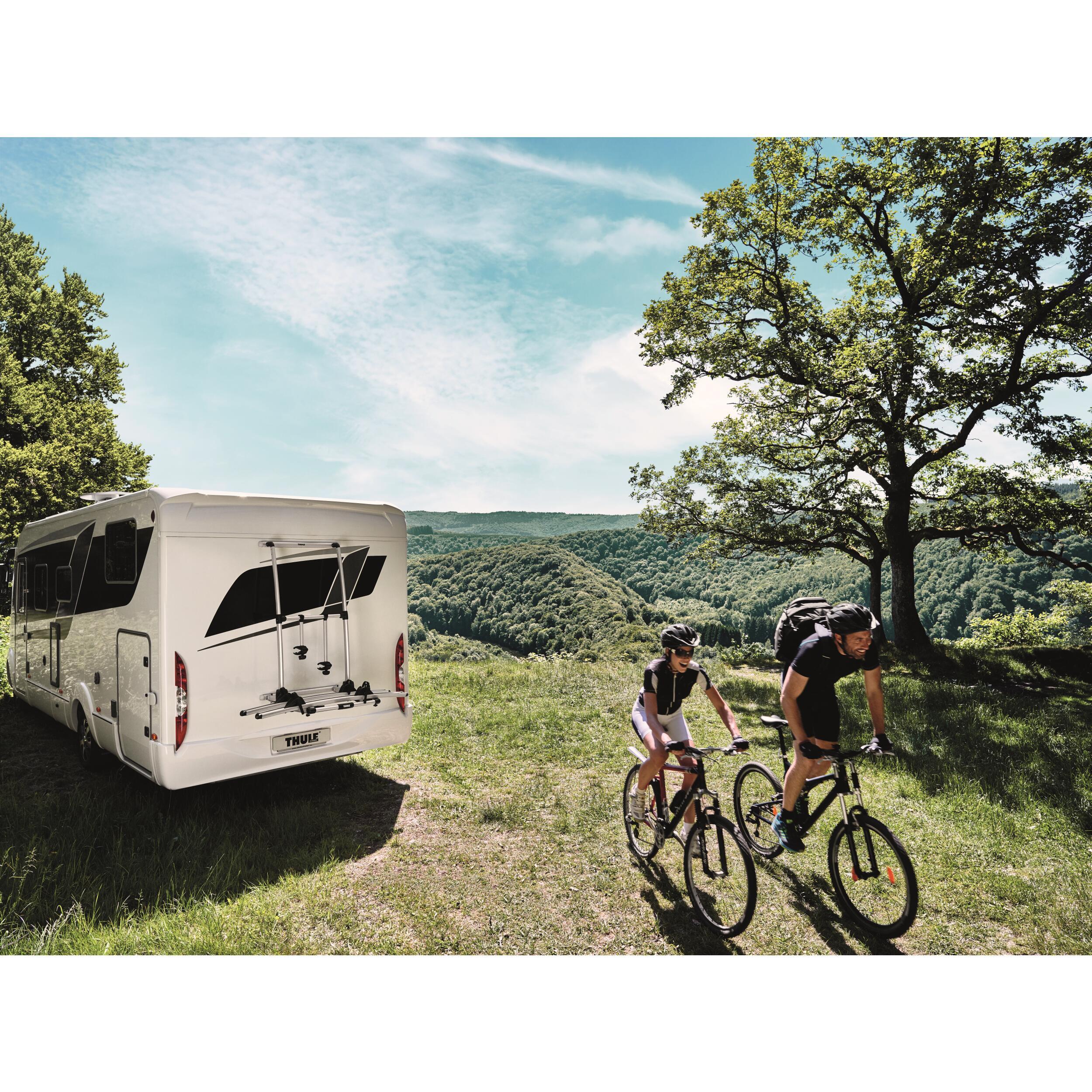 Les porte-vélos Excellent de Thule permettent unefixation stable avec perçage sur la paroi arrière du camping-car ou d'une caravane. Il est possible de la monter sur des rails déjà installés sur votre camping-car, à l'exception des véhicules de loisirs Hymer.