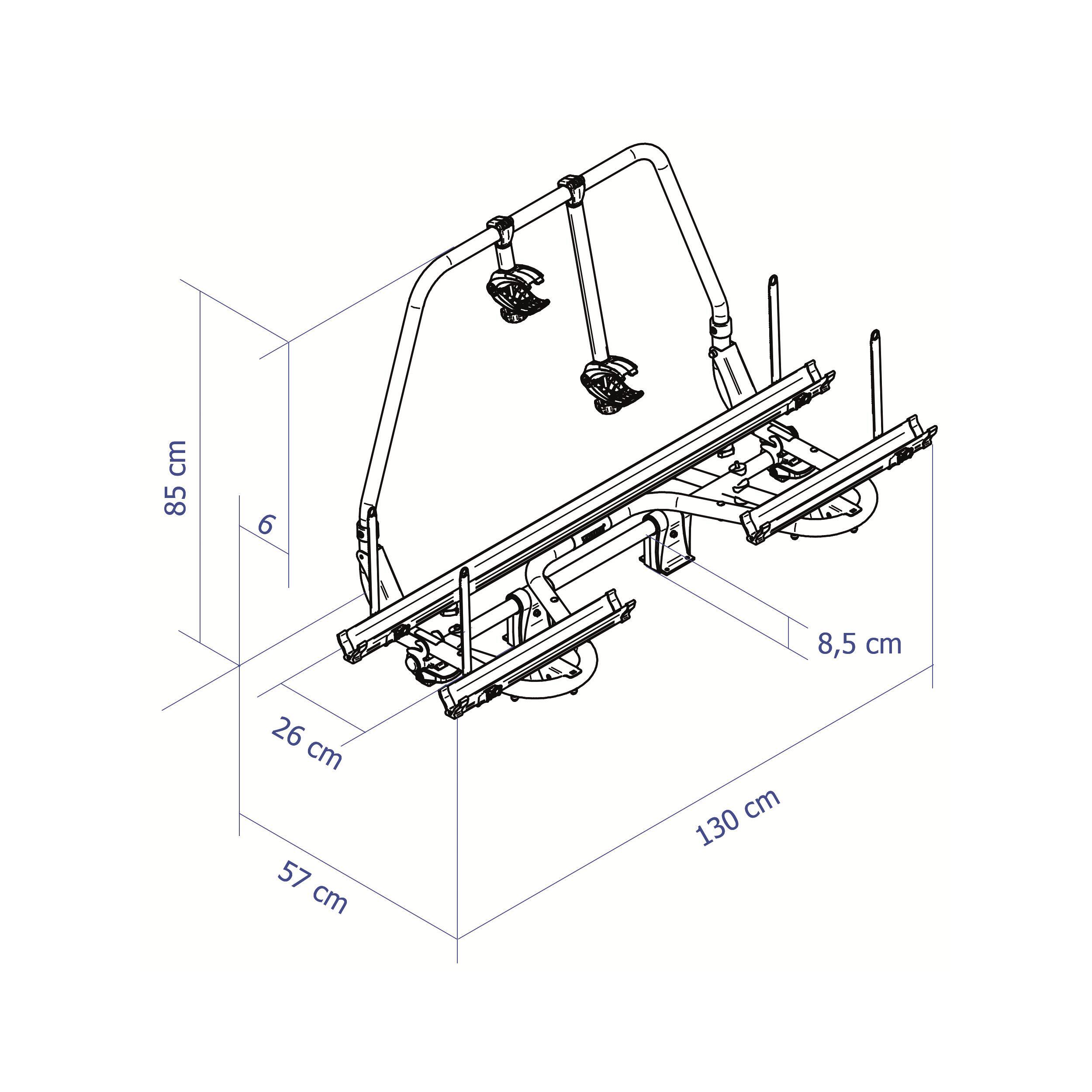 Ce modèle se fixe sur les timons courts avec une longueur de 85 cm. Il transporte 2 vélos maximum sans possibilité d'extension. Compatible VAE, il offre une charge maximale de 60 kg (30 kg par rail). Son poids net est de 14 kg et il ne dispose pas de rails coulissants.