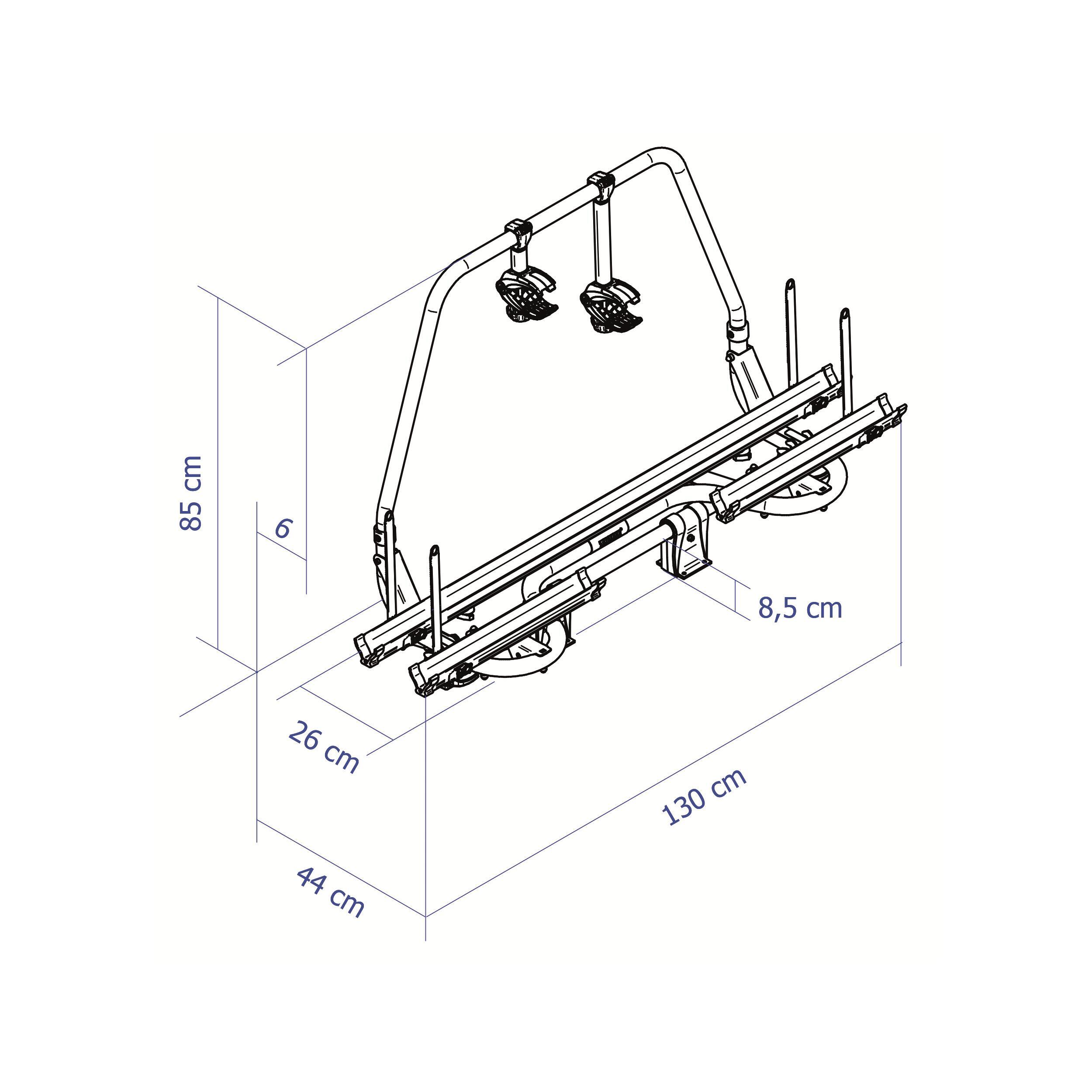 Ce porte vélos s'installe sur le timon et mesure 85 cm de longueur. Il transporte 2 vélos en standard avec possibilité d'extension pour un 3ème vélo. Compatible VAE, il supporte jusqu'à 60 kg de charge maximale, soit 30 kg par rail. Les serrures antivol sont fournies. Son poids net est de 14 kg.