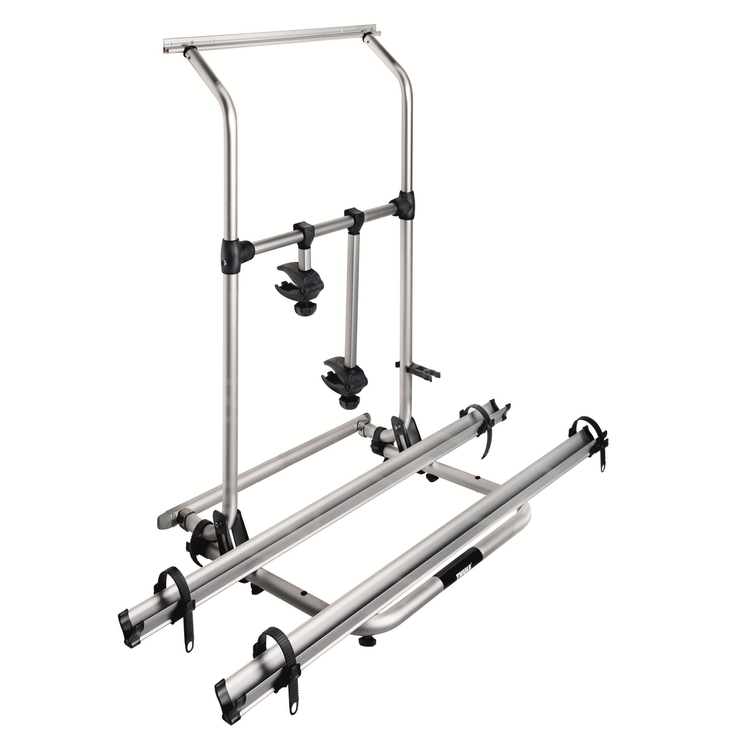 Le porte-vélos Universal de Thule se fixe sous le châssis. Sa longueur est ajustable de 135 à 175 cm et il dispose de rails coulissants. Il transporte 2 vélos maximum sans extension possible. Non compatible VAE, il supporte une charge maximale de 38 kg (19 kg par rail). Son poids net est de 10,6 kg. Les serrures antivol sont en option.