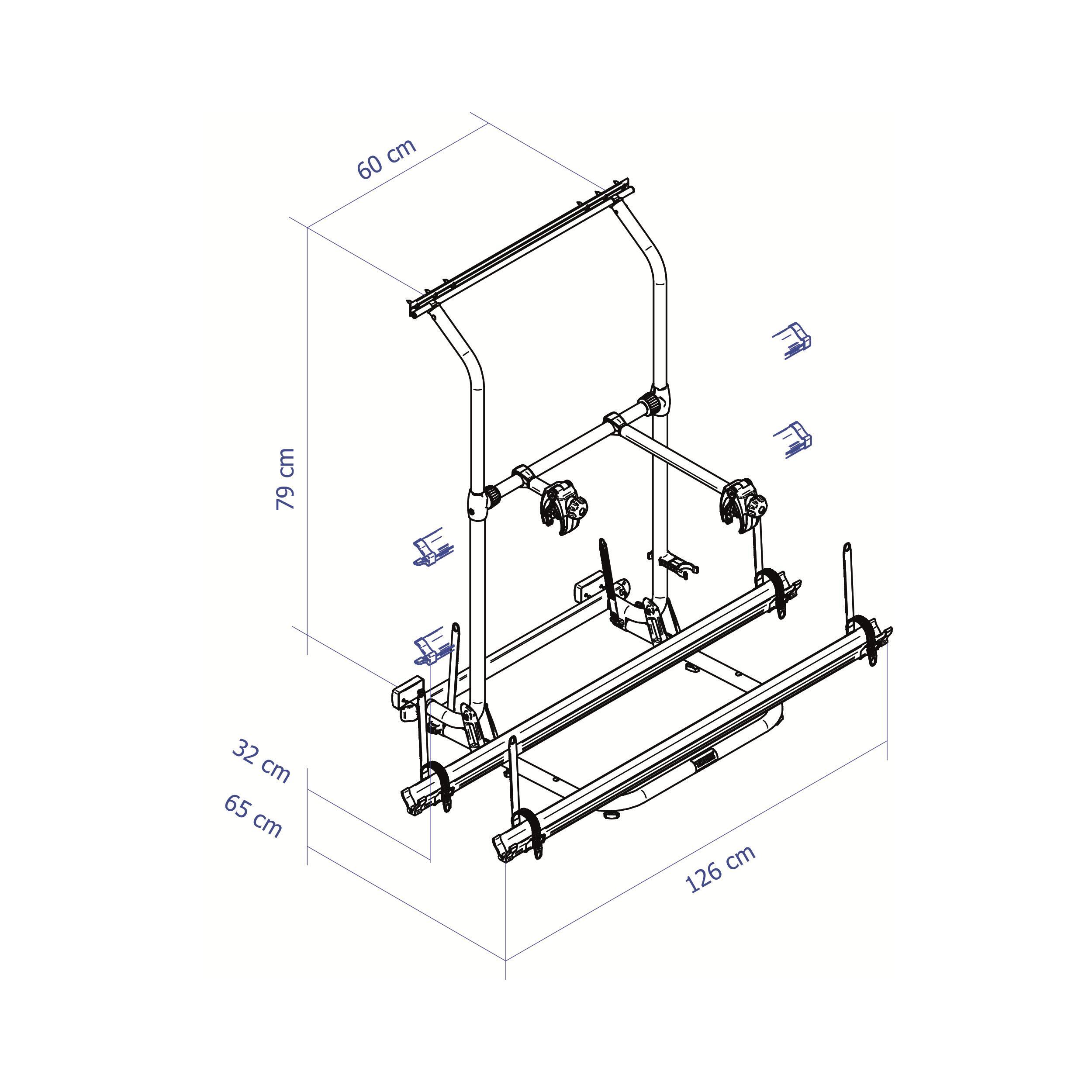 Ce porte vélos s'installe sur le timon et mesure 85 cm de longueur. Il transporte 2 vélos en standard avec possibilité d'extension pour un 3ème vélo. Compatible VAE, il supporte jusqu'à 60 kg de charge maximale, soit 30 kg par rail. Les serrures antivol sont fournies. Son poids net est de 14 kg.