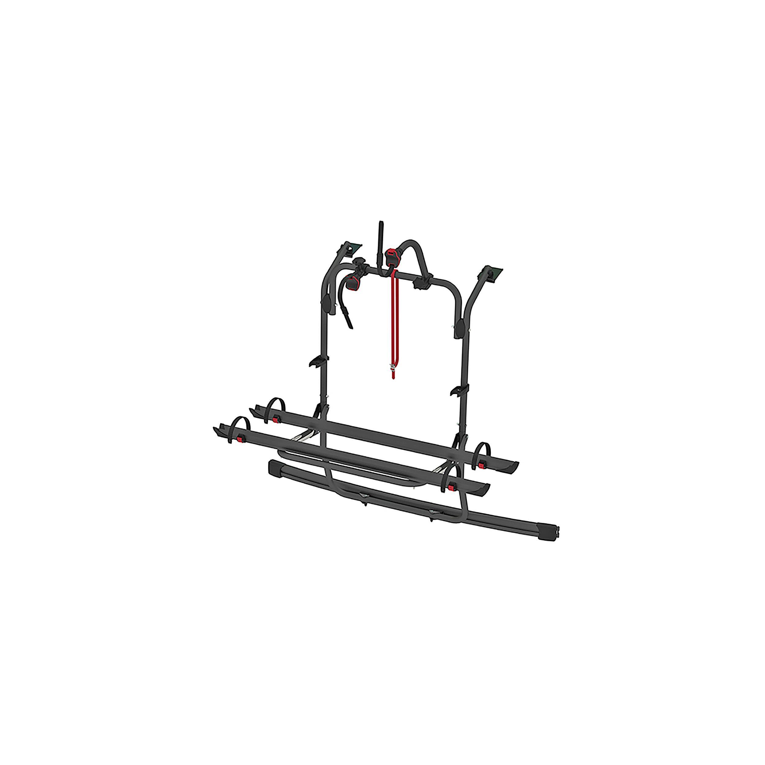 - Fixation sur le hayon arrière sans perçage. Sur le niveau supérieur, le porte-vélos utilise les points renforcés du véhicule pour une fixation robuste et durable et le niveau inférieur se fixe sur le bas de porte.