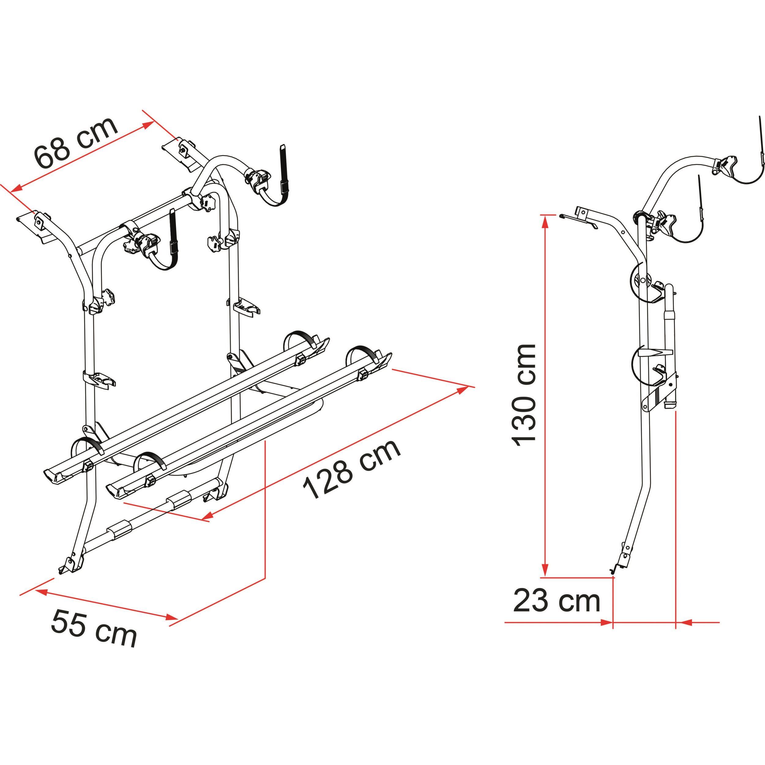 - 2 rails de série pour 2 vélos standards. Possibilité de transformation pour 4 vélos pour un poids total supporté de 60 kg.