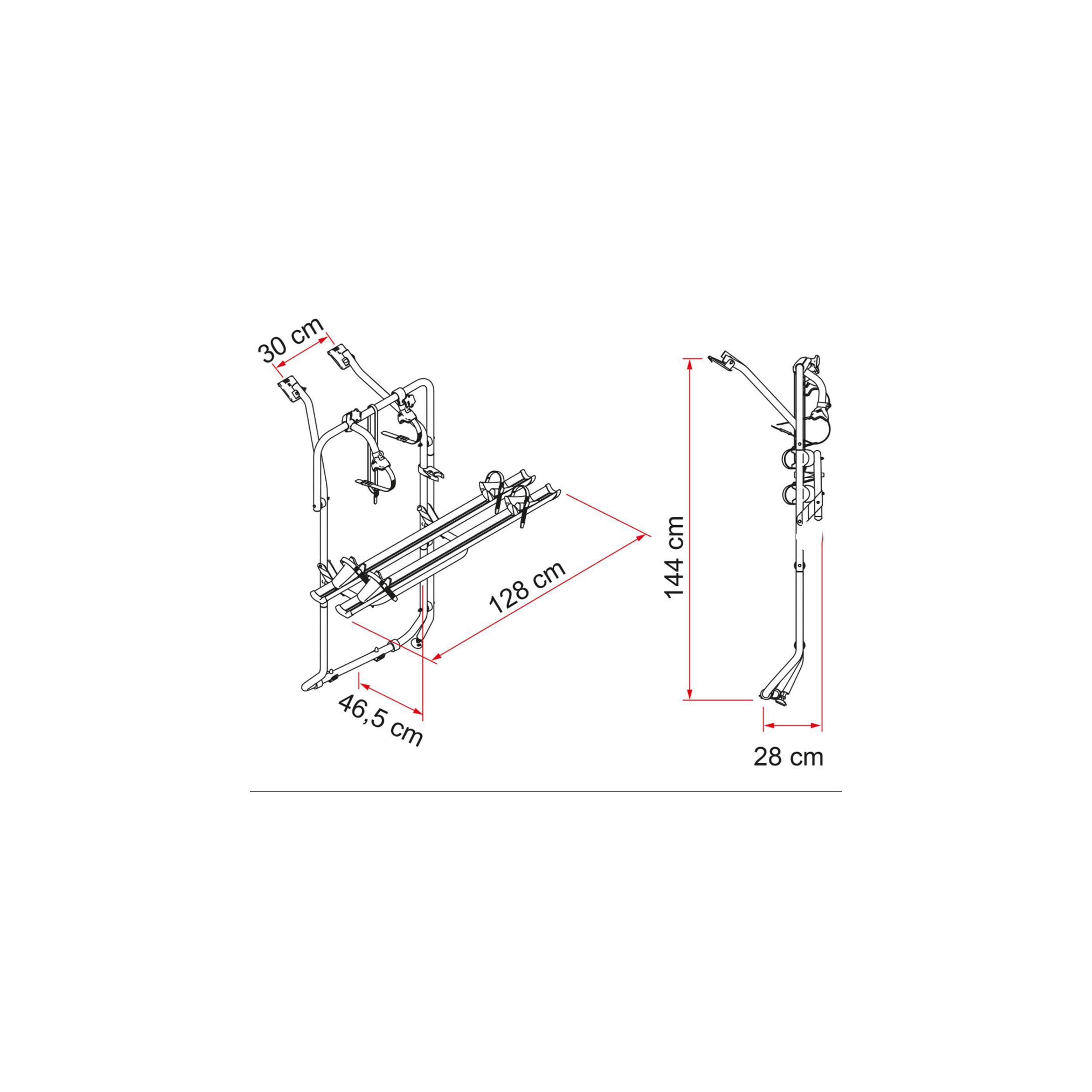 - Entraxe entre pattes de montage : 30 cm. Fixation sur porte gauche sans perçage. Possibilité d'ouvrir la porte avec la plateforme mais sans les vélos.