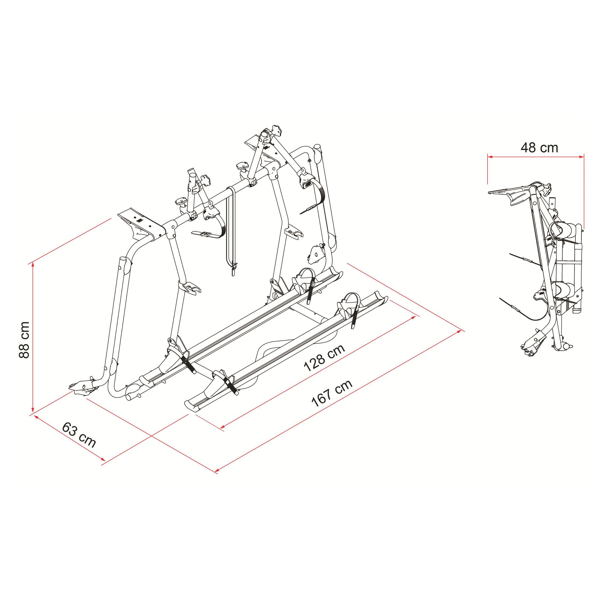 - 2 rails de série avec possibilité de transformation (ajouts rails et bras) pour 4 vélos standards maximum pour un poids total supporté de 60 kg.