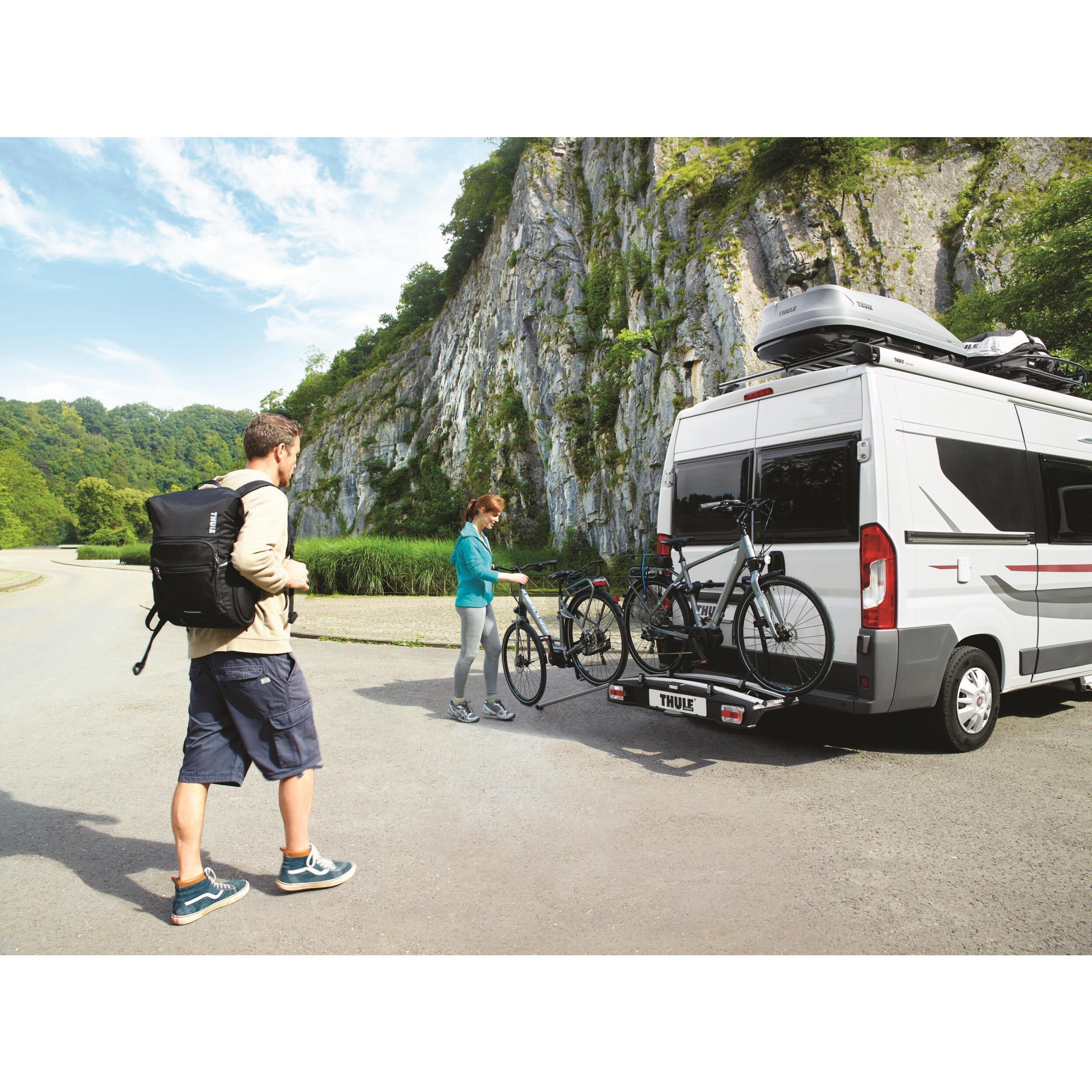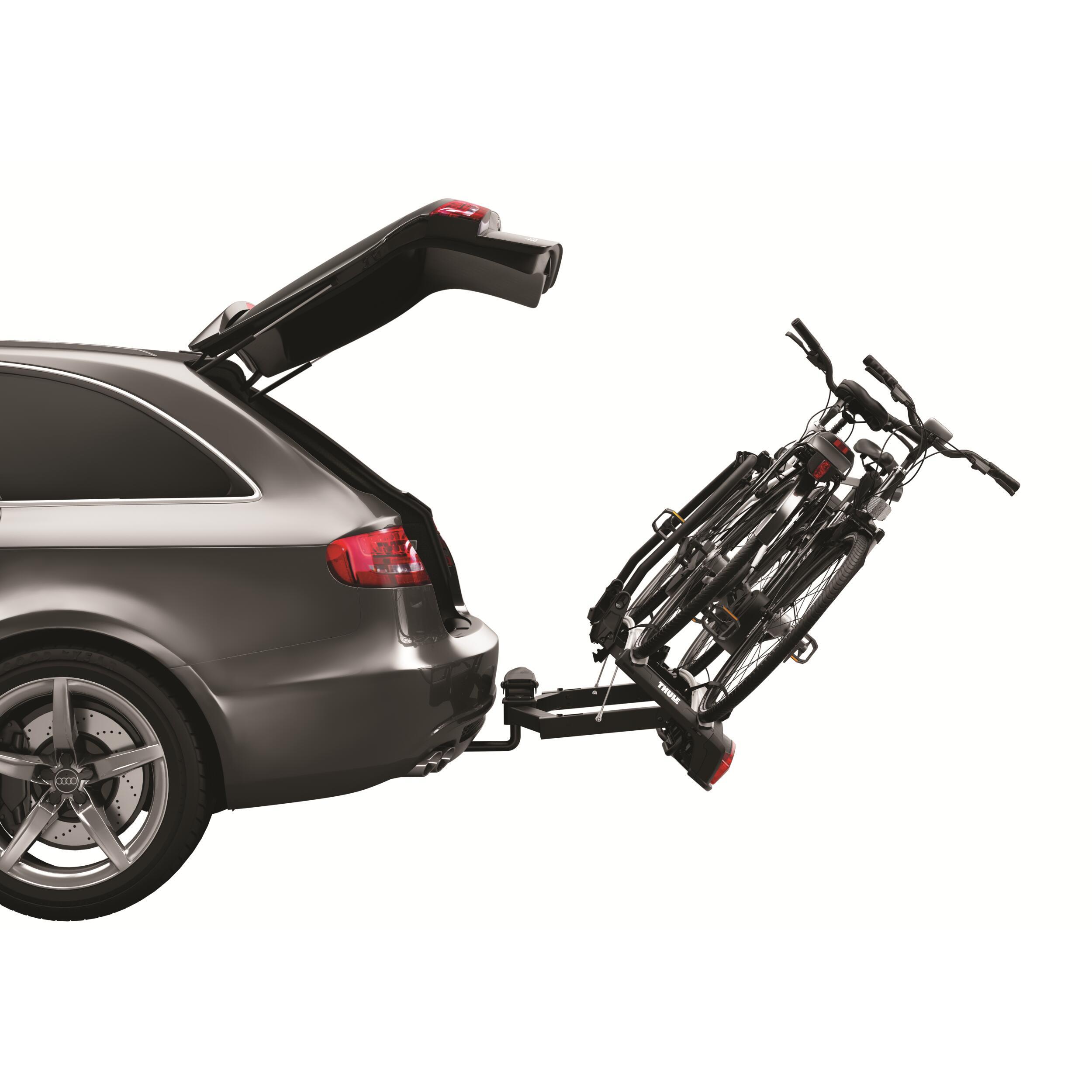 Le porte-vélos Velospace XT de Thule se fixe sur boule d'attelage et transporte vos vélos en toute sécurité. Entièrement pliable et compatible avec tous types de vélos, il se range facilement dans votre coffre.