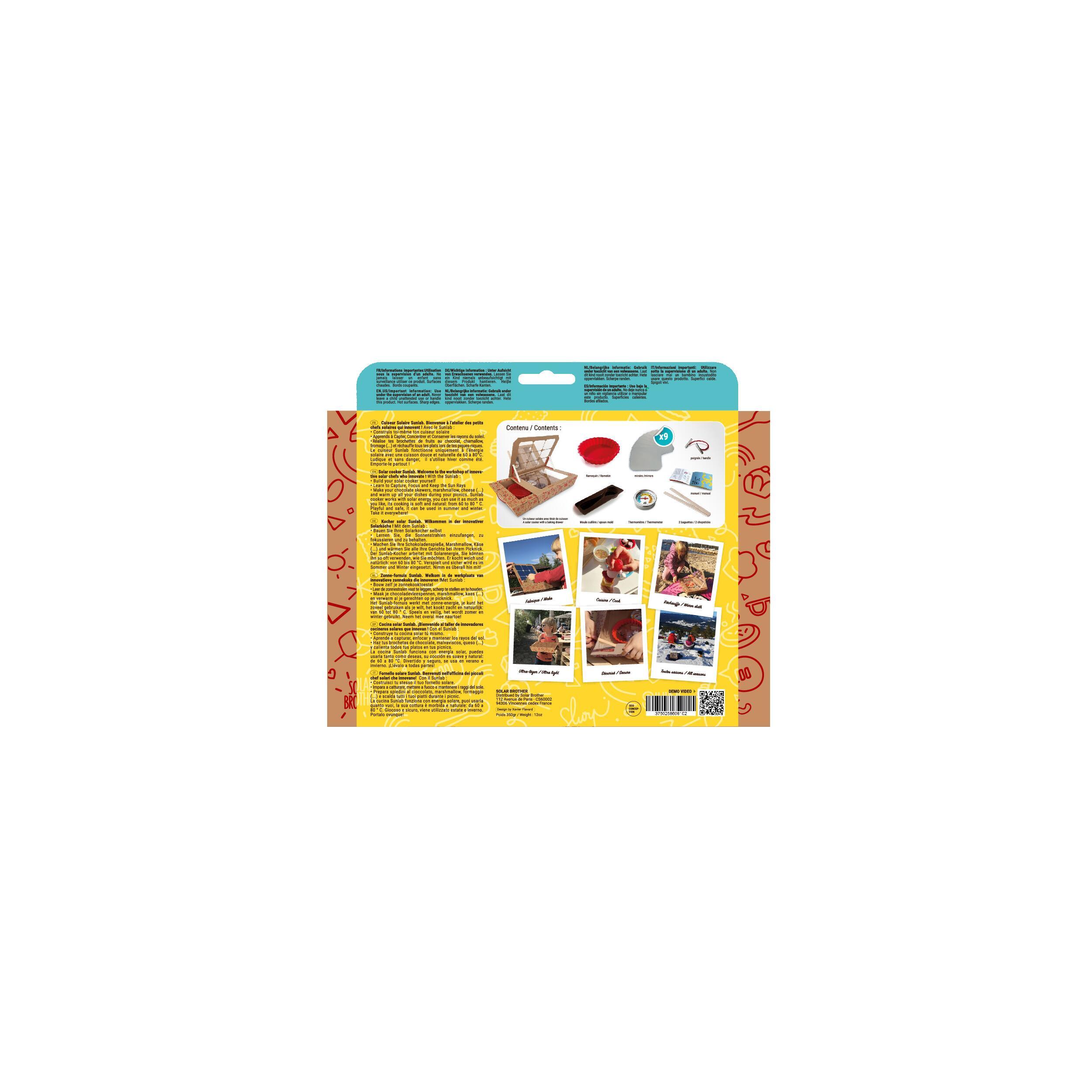 Le cuiseur solaire est destiné aux enfants (à partir de 6 ans). Il s'agit d'une expérience pédagogique pour faire découvrir la cuisson solaire facilement. Le four solaire a été élaboré avec la règle des 3C (Concentration, Captation et Conservation). Les enfants, accompagnés d'adultes, peuvent réaliser de nombreuses recettes gourmandes (chocolat fondu, brochettes de fruits avec chocolat fondu, plats à réchauffer, tartines au fromage...). Une activité très ludique et simple pour vos enfants futurs chefs !