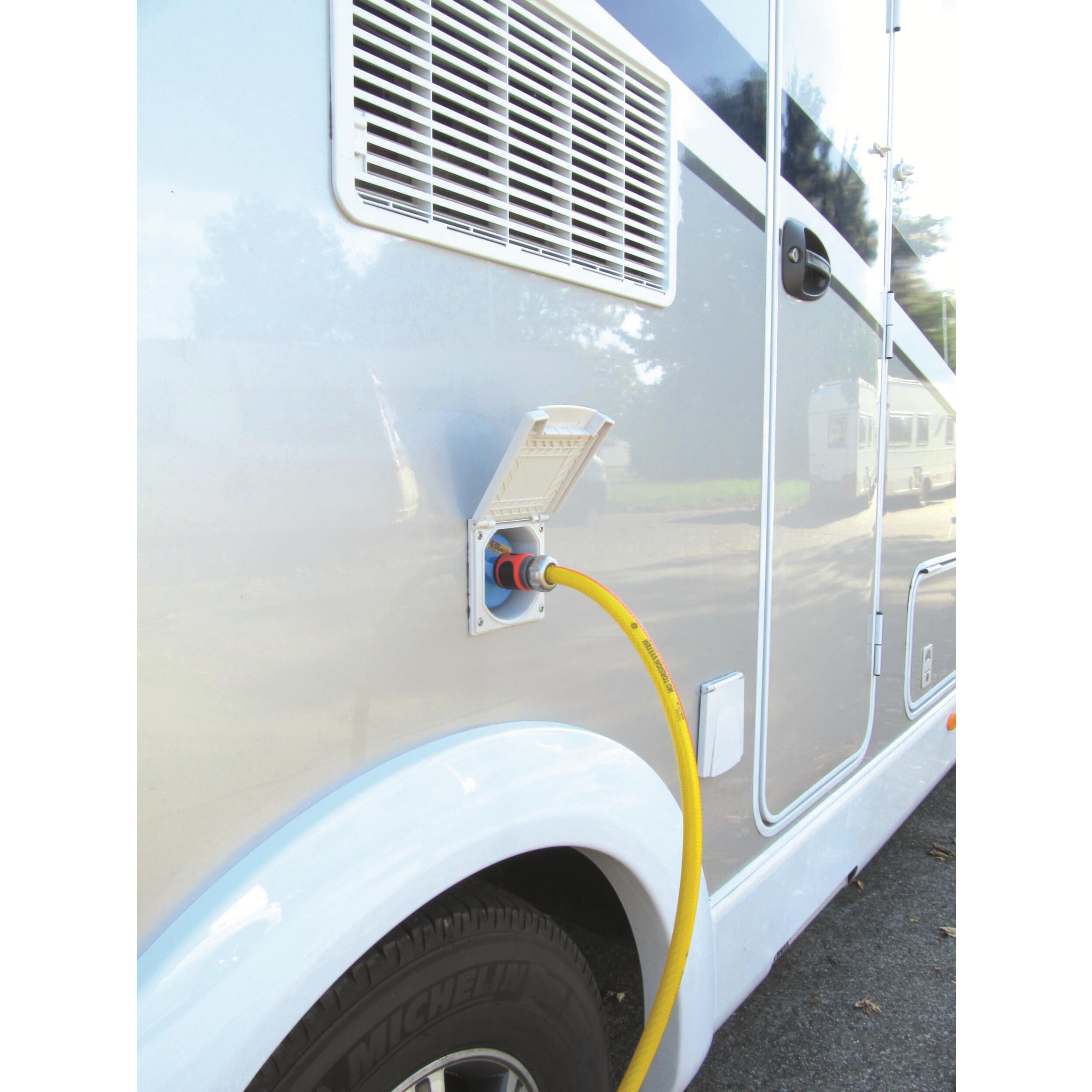 Bouchon de remplissage Heos pour camping-car et caravane. Ce bouchon de remplissage vous permettra de remplir le réservoir d'eau de votre véhicule de loisirs : camping-car, caravane ou fourgon aménagé. Son installation est facile en remplacement du bouchon d'origine et un raccord rapide permet une connexion aisée au tuyau d'arrosage. Vous n'avez plus besoin de tenir le tuyau, le remplissage se fait rapidement, hygiéniquement et sans perte. Convient pour les réservoirs d'eau avec ou sans trop-plein avec fermeture de baïonnette. Fourni avec bague de réduction tuyau diamètre 67 mm et joint plat pour réservoir avec trop-plein.