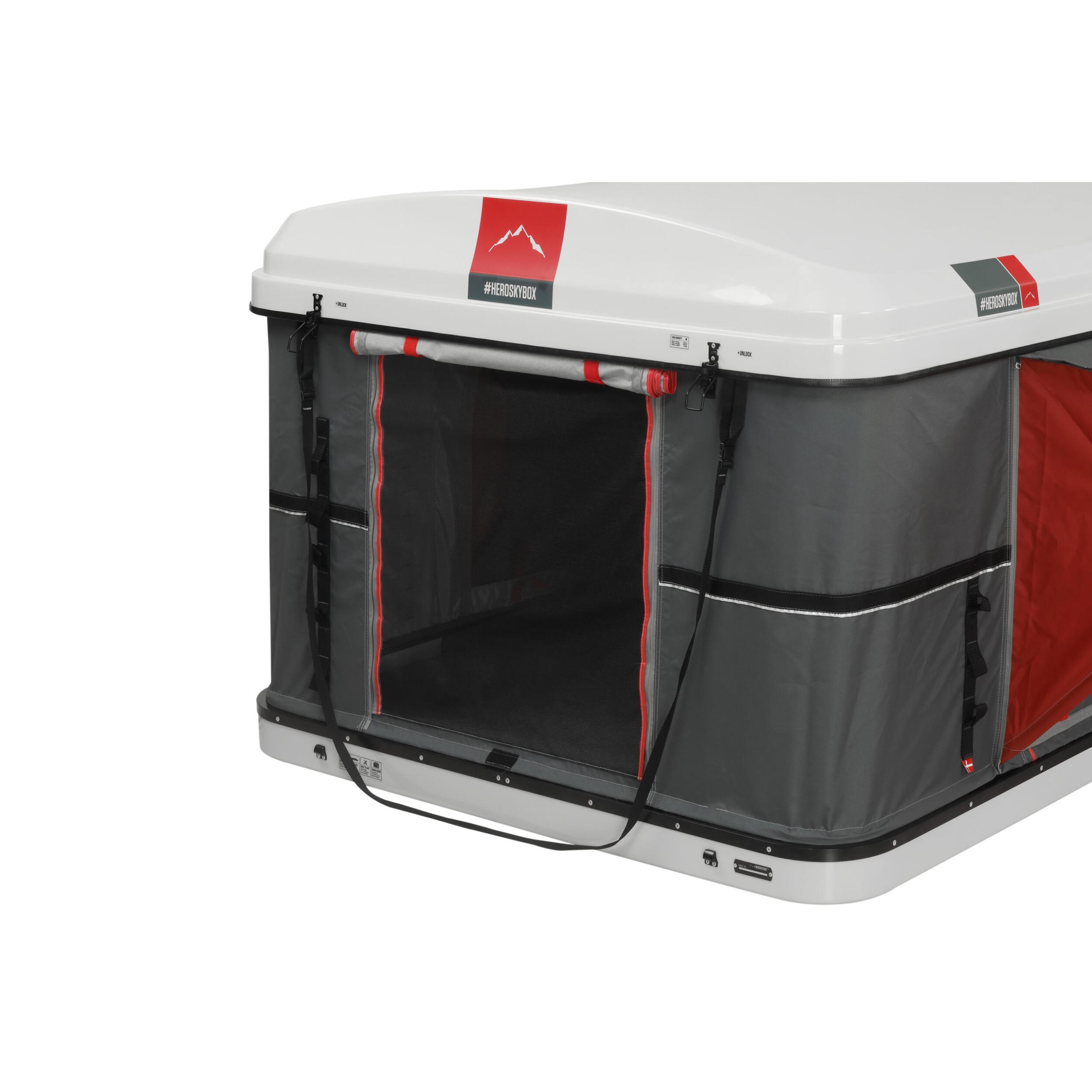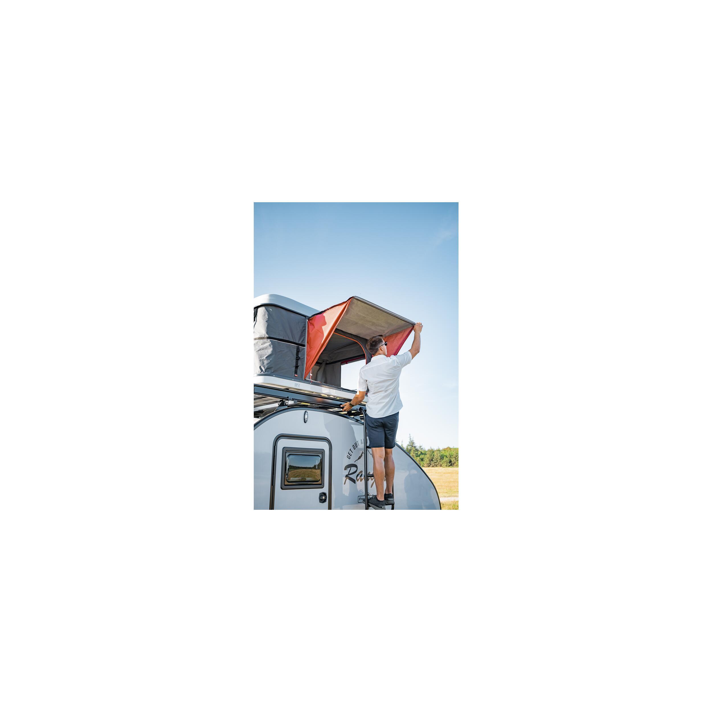 La coque en fibre de verre enduite de gel de la tente de toit est durable, solide et rigide. Le tissu gris et rouge de la housse de tente convient pour tous temps. Elle possède des sangles élastiques et est composé d'un petit auvent Airtex sur le côté. Vous pourrez ainsi en profiter en journée et observer le coucher de soleil par exemple.