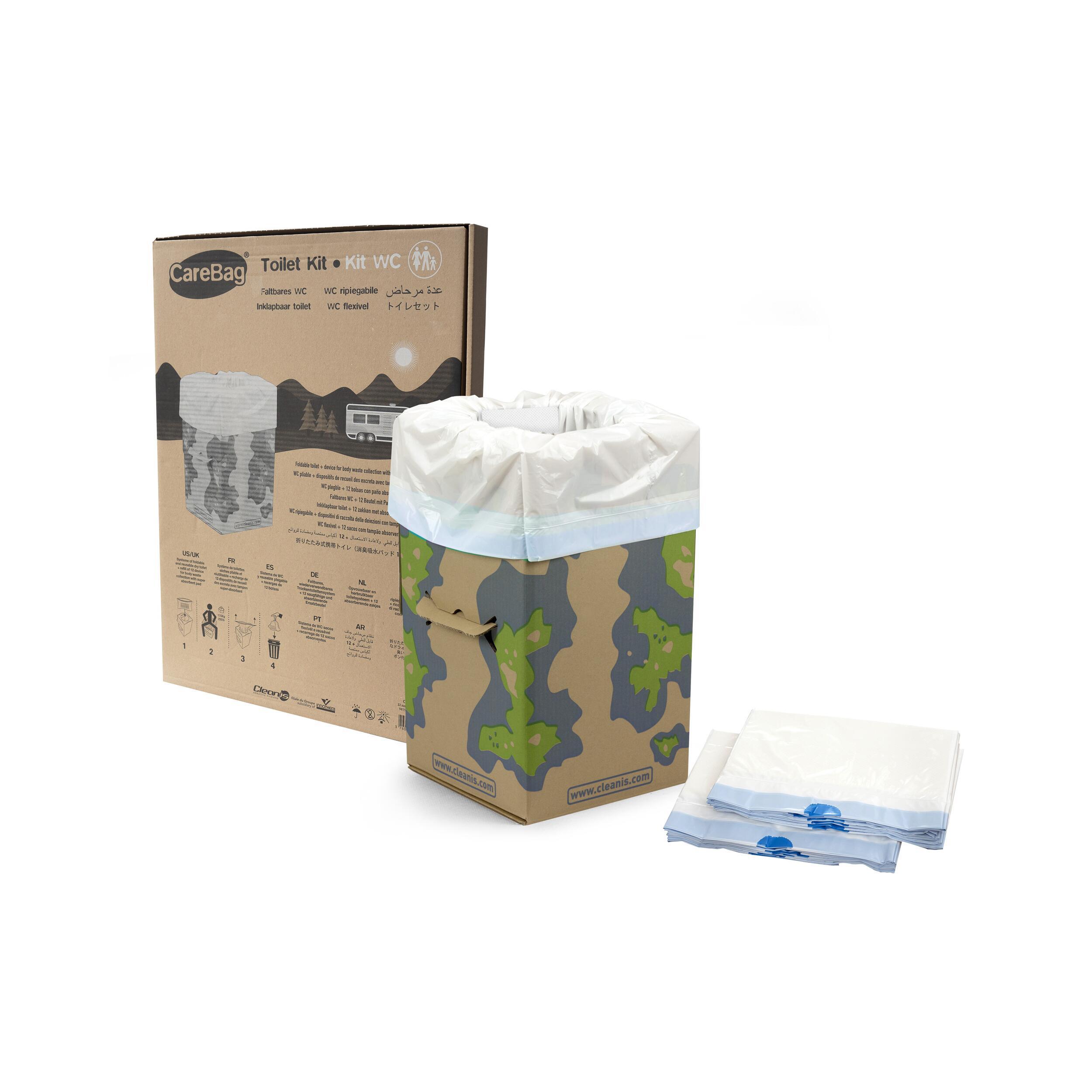Assise constituée d'un caisson WC en carton rigidifié, bords non tranchants, pliable, montable et démontable, réutilisable de nombreuses fois, avec une résistance de 115kg. 12 sacs absorbants protège-WC inclus.