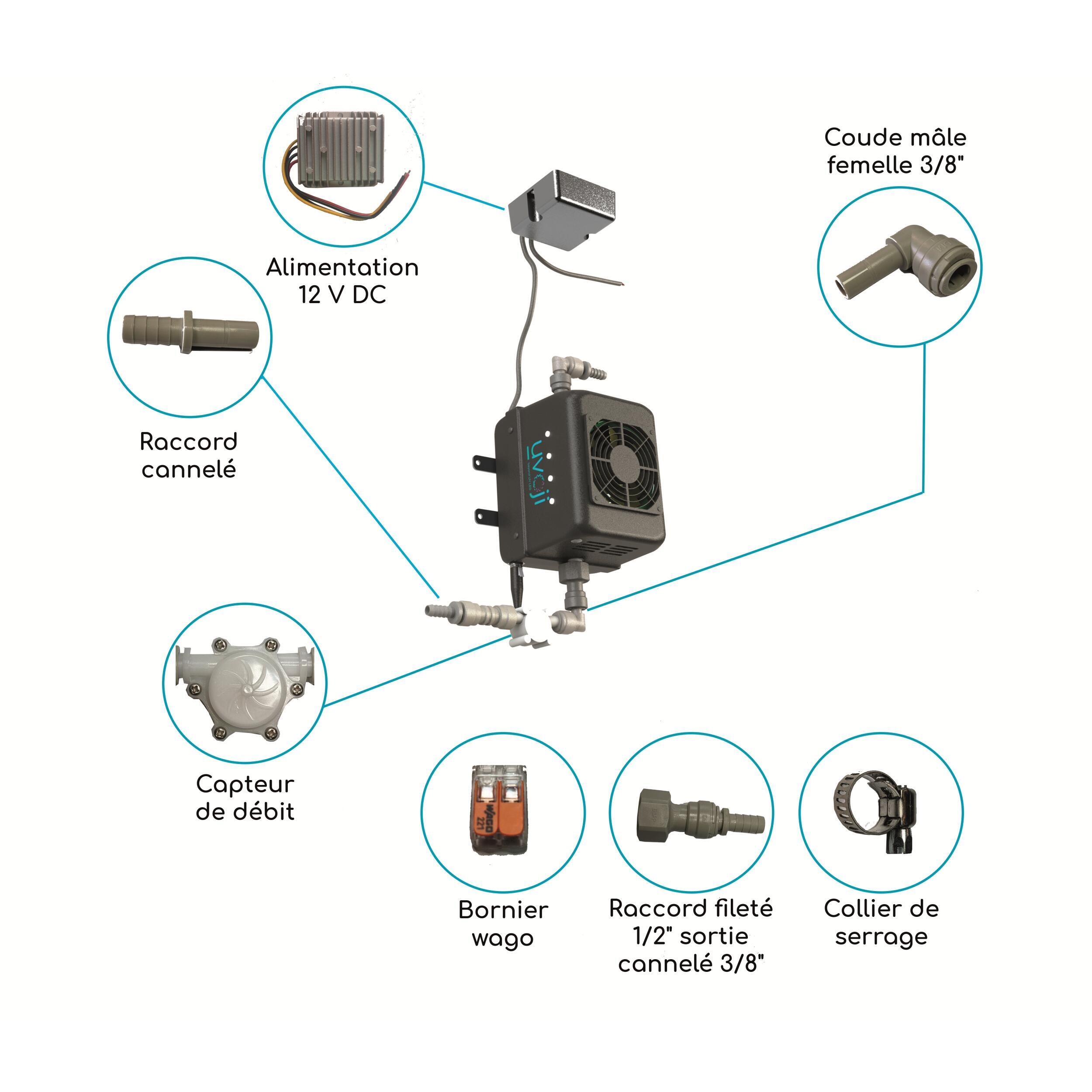 Le purificateur d'eau Uvoji est livré avec 4 raccords cannelés pour tuyau ø 10/12 mm, un débitmètre pour allumage automatique, une alimentation 12V, les accessoires de fixation et une notice.