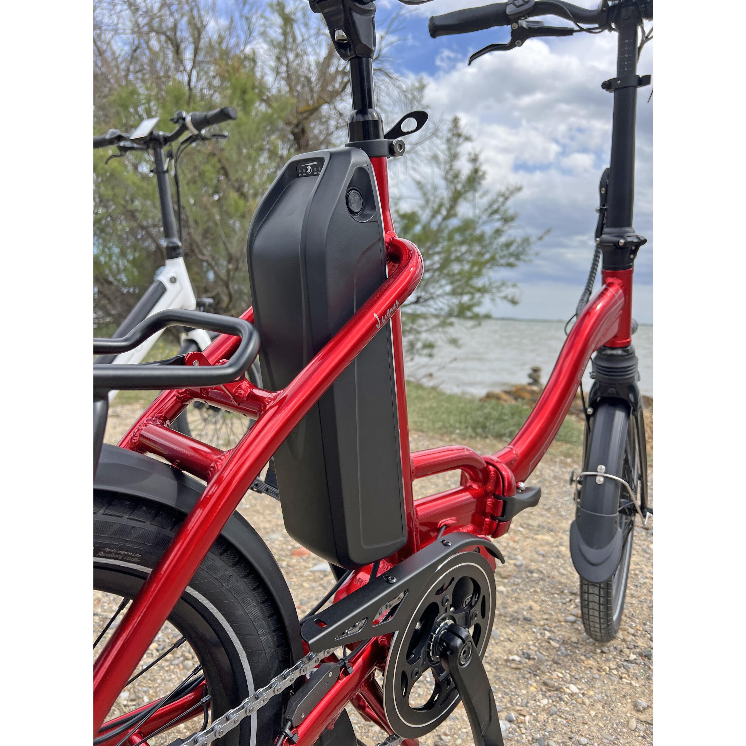 - Déplacements intermodaux et stockage facilité :levélo électrique JUNY est pliant. Il rentrera sans problème dans votre coffre de voiture, dans la soute de votre camping-car ou dans le train pour un transport vélotaf intermodal. Les dimensions pliées sont de 86 x 46 x 88 cm.